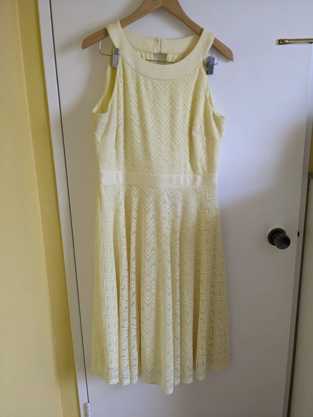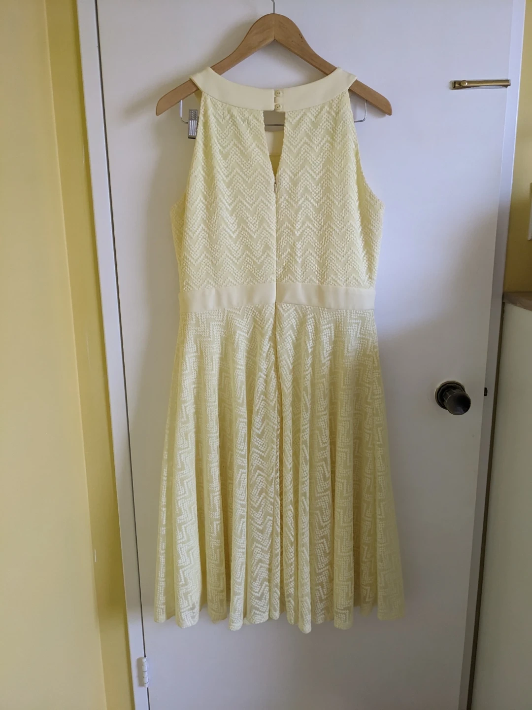 This is a Ricki's sleeveless lace dress in a lovely pale yellow. It has a patterned lace overlay with a smooth lining. The dress features a halter neckline and a fitted waist with a flared skirt. It's a size 12. This dress is perfect for a summer event or a garden party!