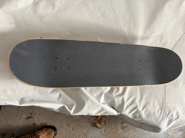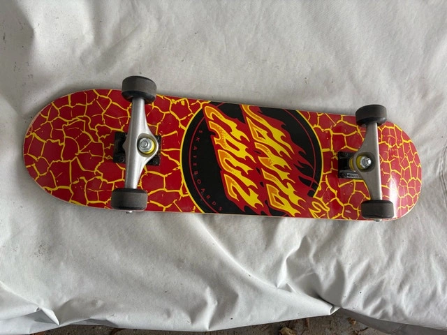 Selling my gently used Santa Cruz Flame Dot complete skateboard. This is a classic setup with the eye-catching red deck featuring a yellow crackle lava pattern and the iconic flame logo in the center. It’s been ridden lightly, so there’s only minor scuffing on the edges and wheels—still rolls smooth and has plenty of life left. Perfect for beginners, street skating, or just cruising around. Specs: Deck: 8.25” width x 31.5” length, 7-ply hard rock maple. Trucks: Bullet 145mm (silver). Wheels: 52mm black urethane. Bearings: ABEC-5. No major damage, grip tape is intact, and it’s ready to ride.