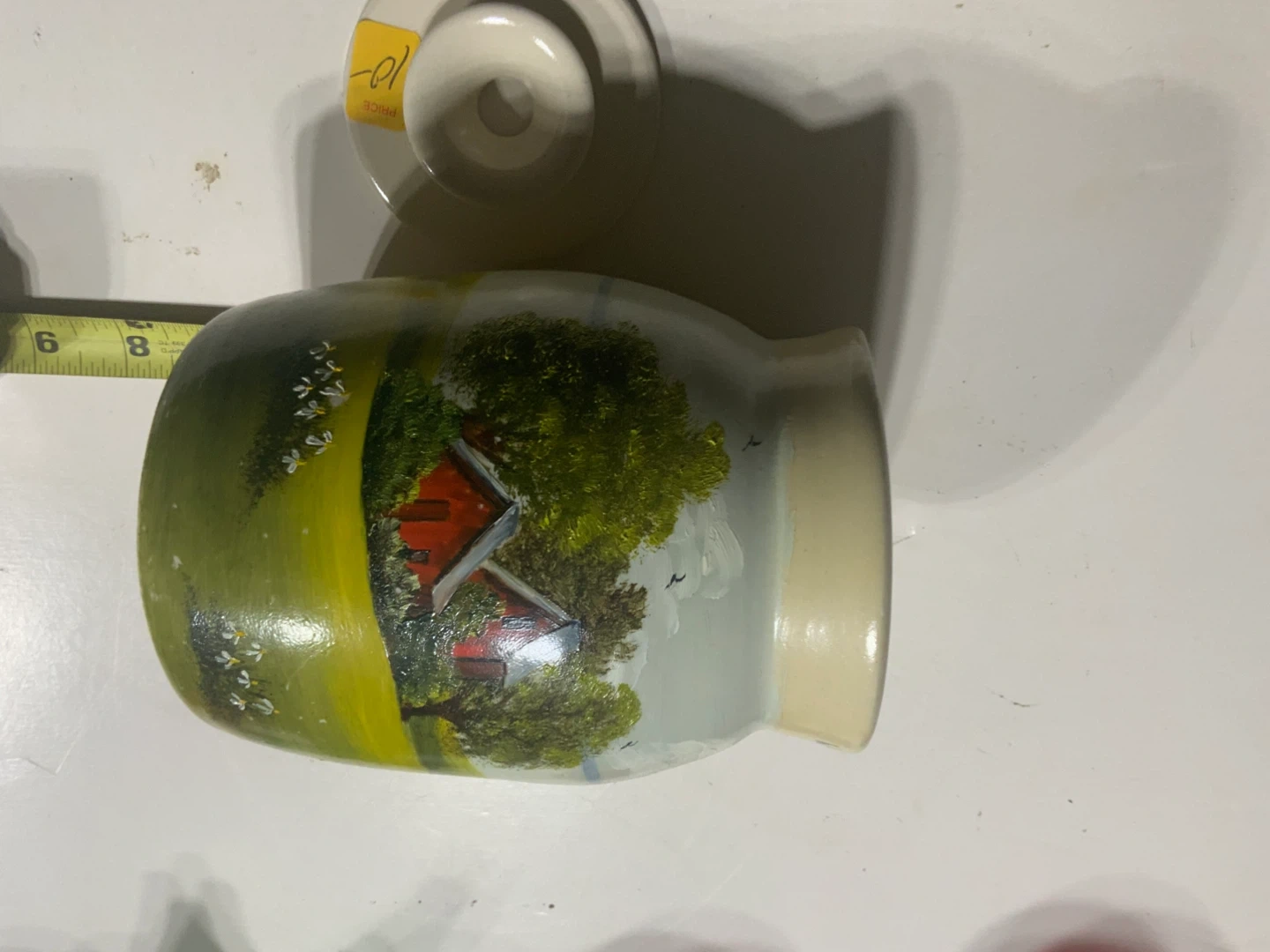 This is a ceramic jar featuring a hand-painted barnyard scene. It includes a matching lid with a knob. The interior is clean and ready for use. A lovely piece for kitchen storage or decoration!
