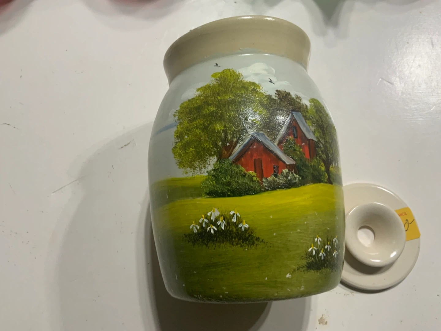 This is a ceramic jar featuring a hand-painted barnyard scene. It includes a matching lid with a knob. The interior is clean and ready for use. A lovely piece for kitchen storage or decoration!