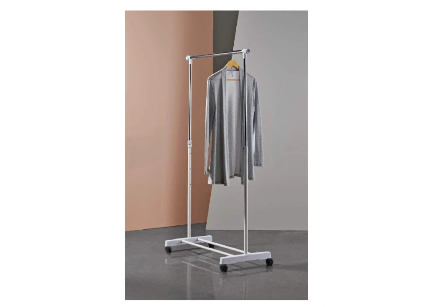 Get organized with this adjustable garment rack! It's perfect for adding extra hanging space in your closet, laundry room, or even for displaying clothes in a store. The rack is white and chrome, and it features an adjustable height to accommodate different lengths of clothing. It also has wheels for easy mobility