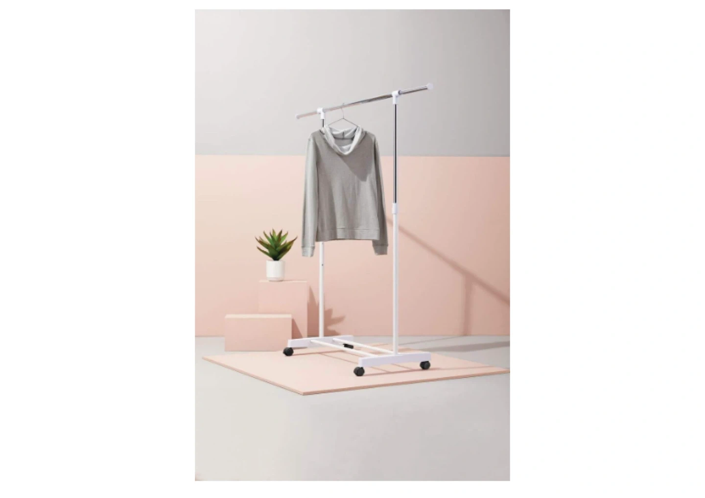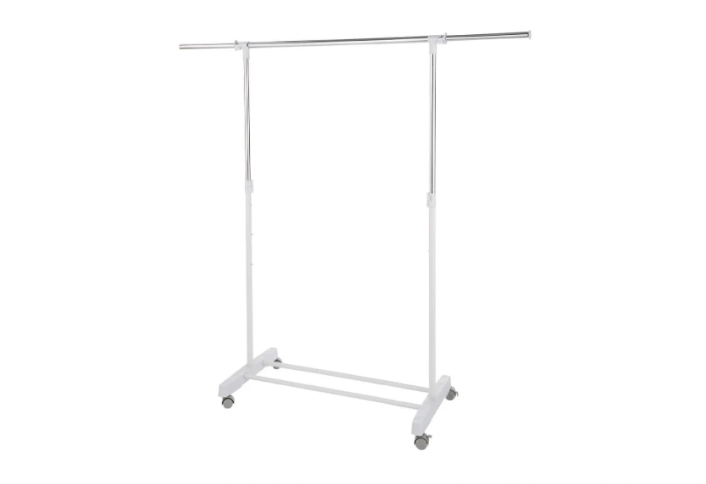 Get organized with this adjustable garment rack! It's perfect for adding extra hanging space in your closet, laundry room, or even for displaying clothes in a store. The rack is white and chrome, and it features an adjustable height to accommodate different lengths of clothing. It also has wheels for easy mobility