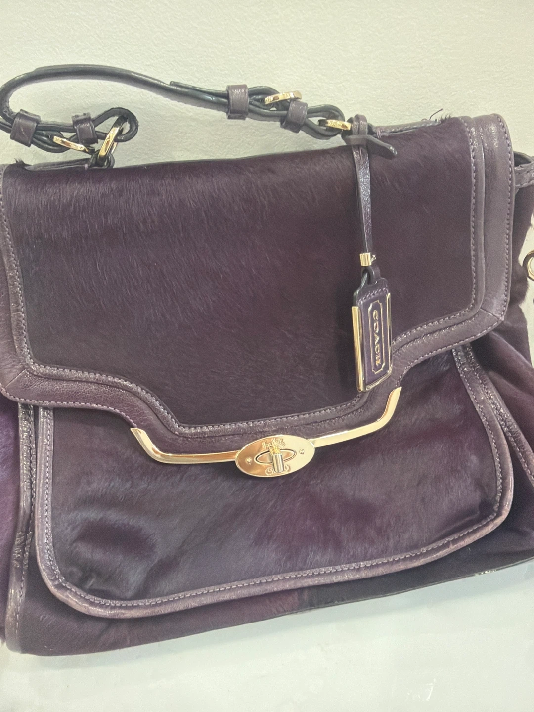 This is a purple Coach handbag. It features a turn-lock closure and a gold-tone chain strap. The bag is made of pony hair and leather.