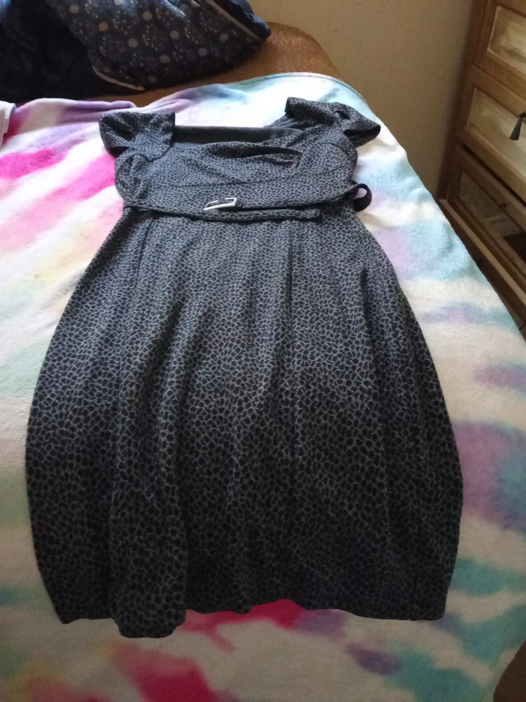 This is a women's short sleeve dress with a leopard print. It has a cinched waist with a buckle detail. The material is a soft knit fabric.
