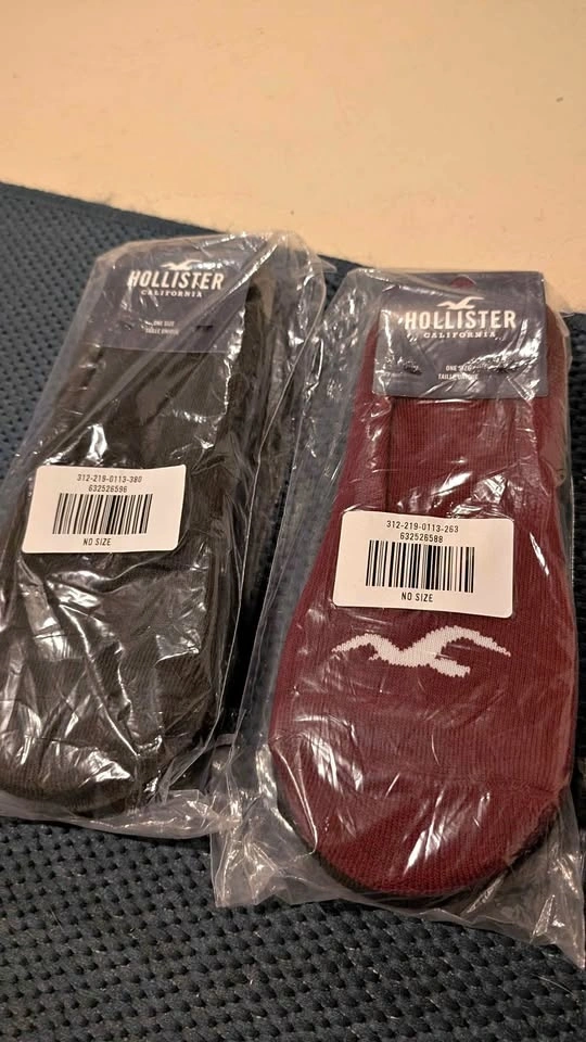 New men's no show Hollister socks. Two packs, six pairs total. One size. Still in original packaging with tags. Original price $13.95 CAD each. Selling both for $10. Pickup in Alpine Park or downtown near Chinatown on select weekdays.