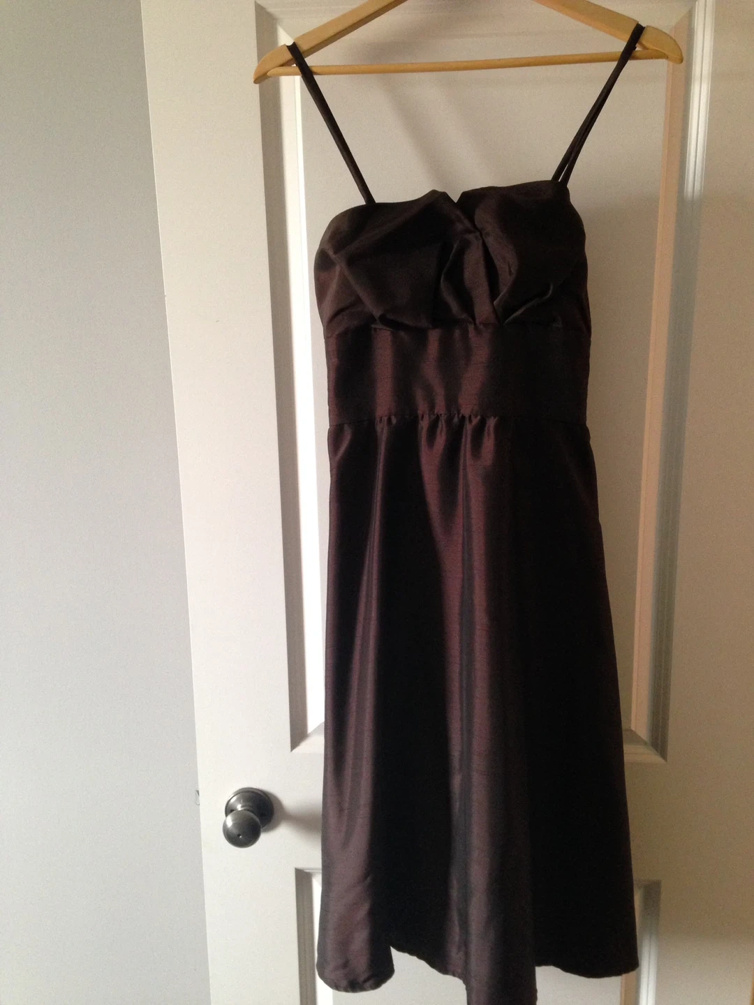 This brown satin midi dress features thin straps and a crumb catcher bodice detail (will need to be starched). It's made from a lightweight, shimmering satin. Worn once. From a smoke-free, bug free, dog friendly home. This dress would be great for a formal event or a night out!