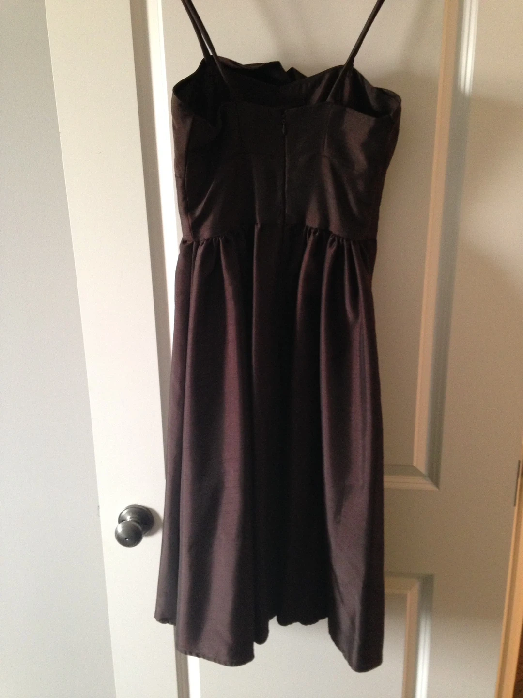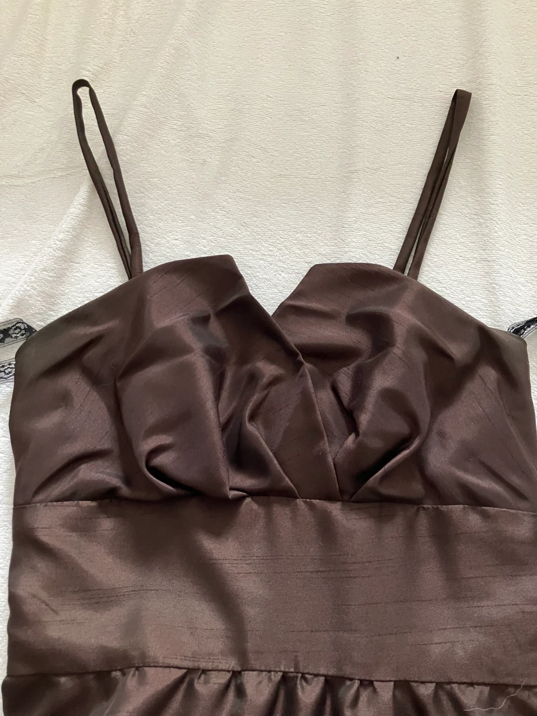 This brown satin midi dress features thin straps and a crumb catcher bodice detail (will need to be starched). It's made from a lightweight, shimmering satin. Worn once. From a smoke-free, bug free, dog friendly home. This dress would be great for a formal event or a night out!