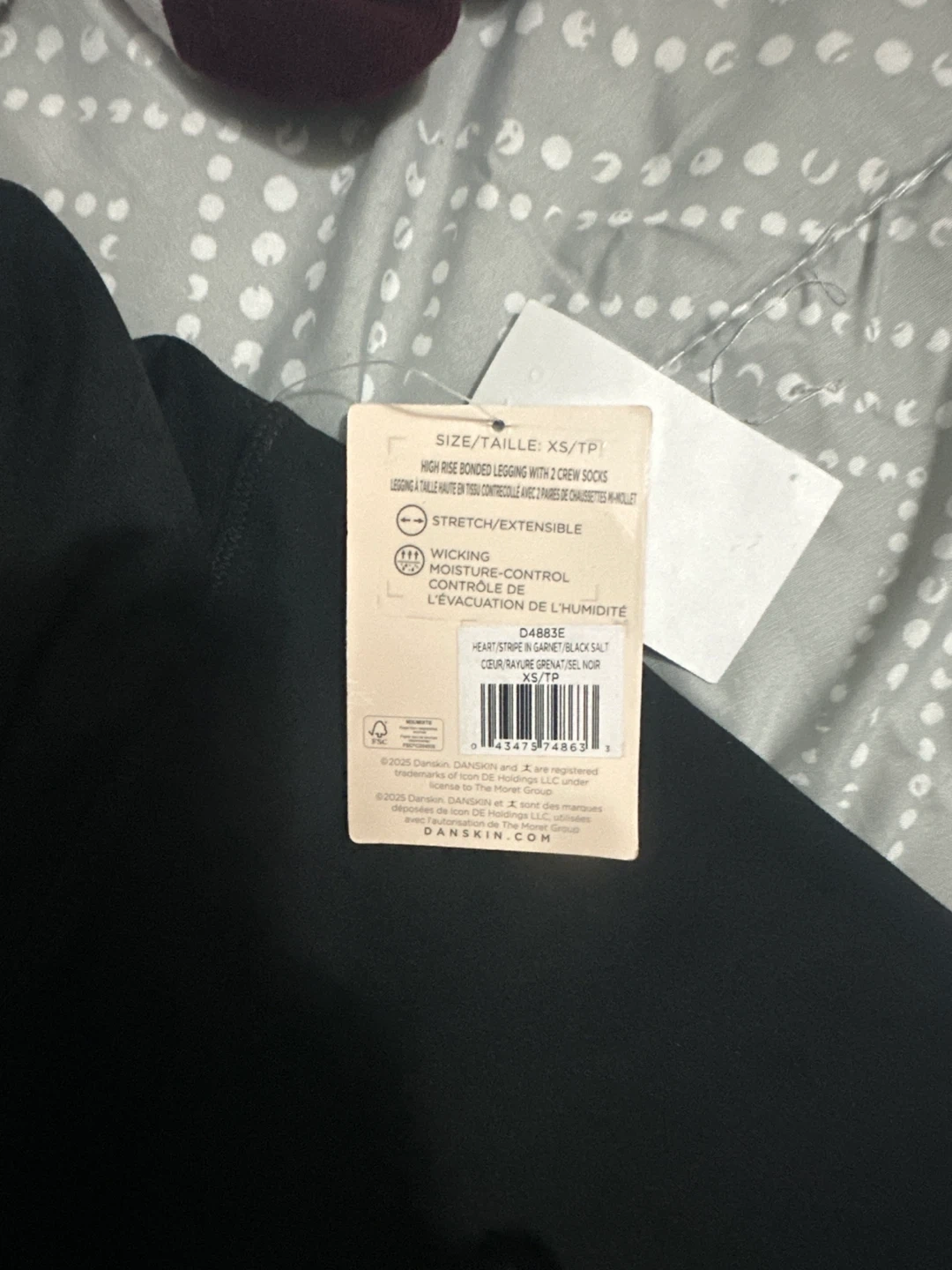 Danskin high rise bonded leggings in black, size XS/TP. Includes 2 pairs of crew socks. Wicking material for moisture control.