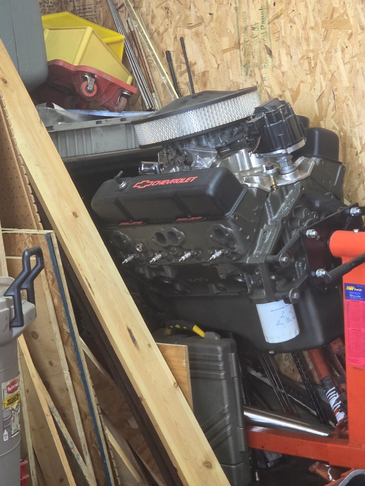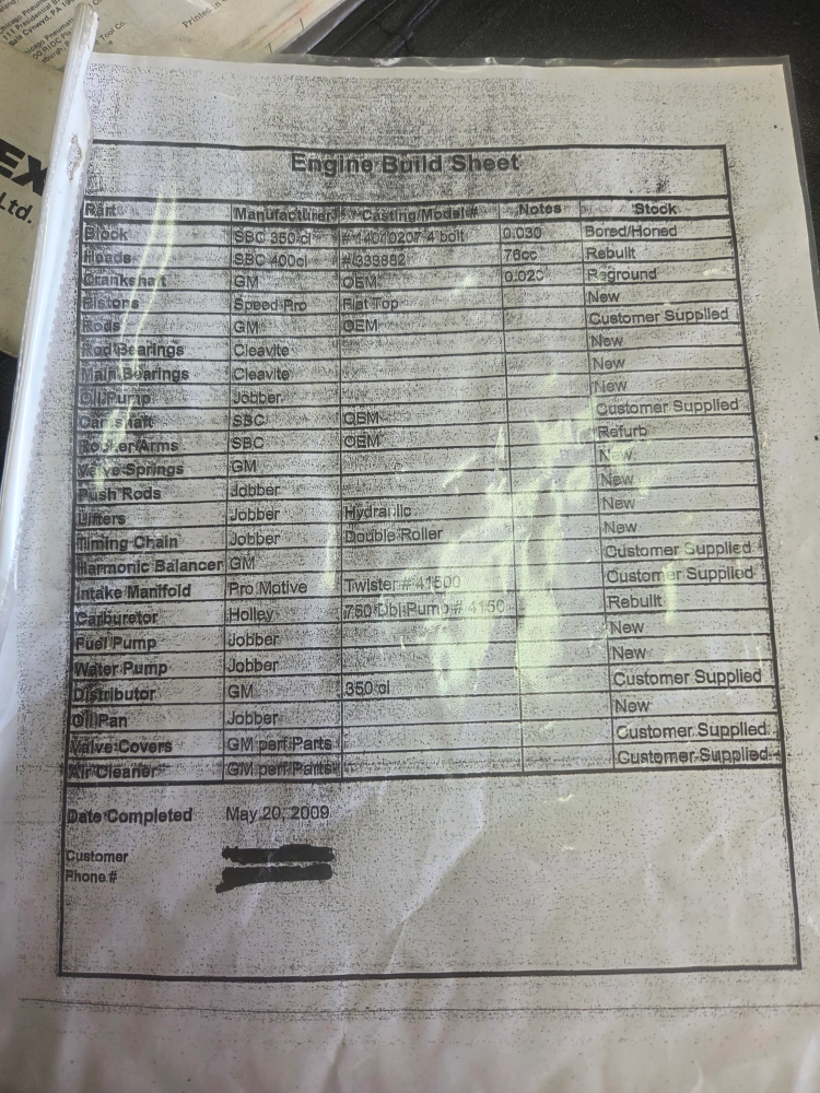 Selling a Chevrolet 350ci engine. The engine build sheet indicates the date completed was May 20, 2009. Parts include: SBC 350ci block, SBC 400ci headers, crankshaft, pistons, rods, main bearings, oil pump, camshaft, rocker arms, valve springs, push rods, lifters, timing chain, harmonic balancer, intake manifold, carburetor, fuel pump, water pump, distributor, oil pan, valve covers, and air cleaner