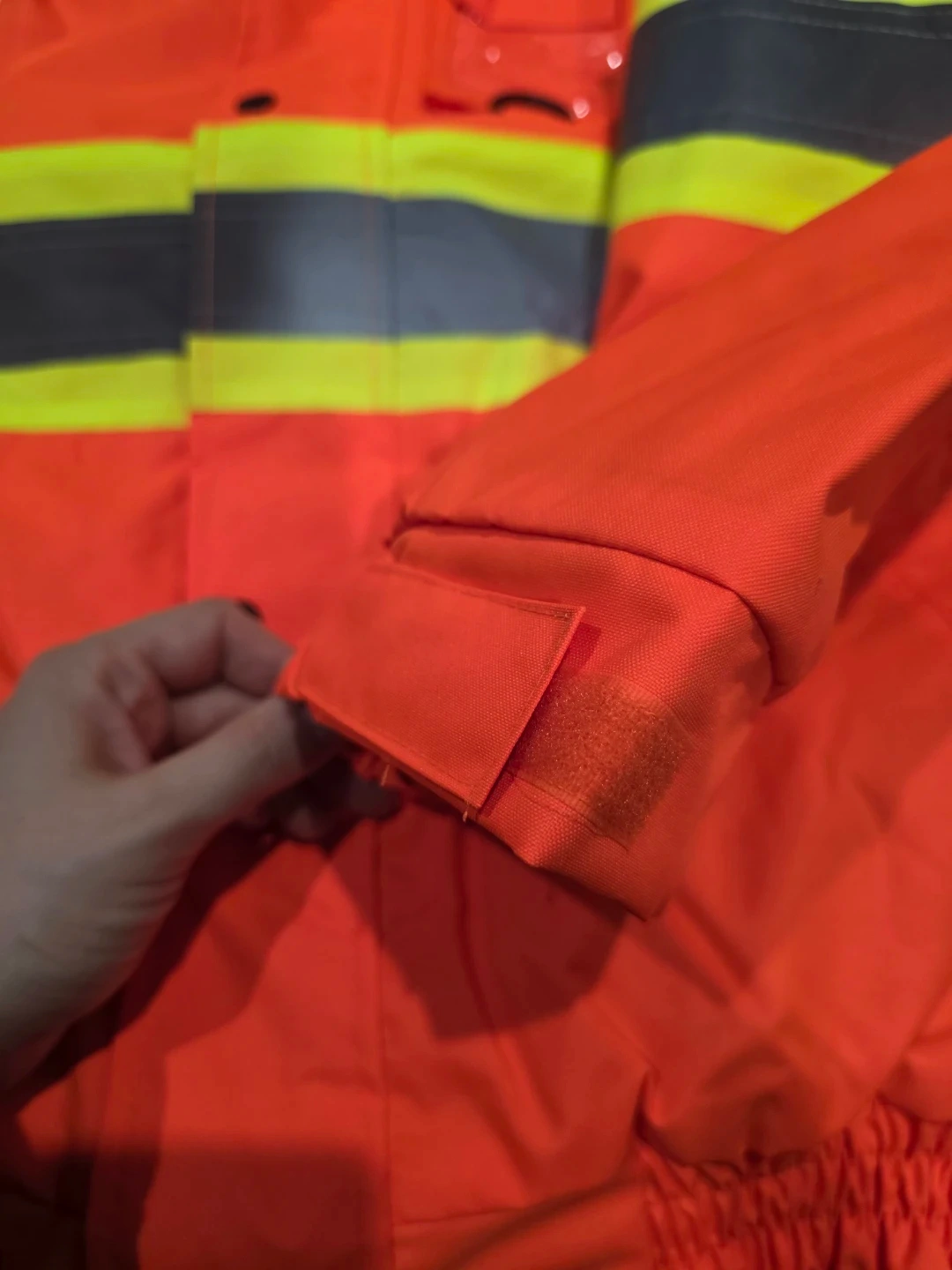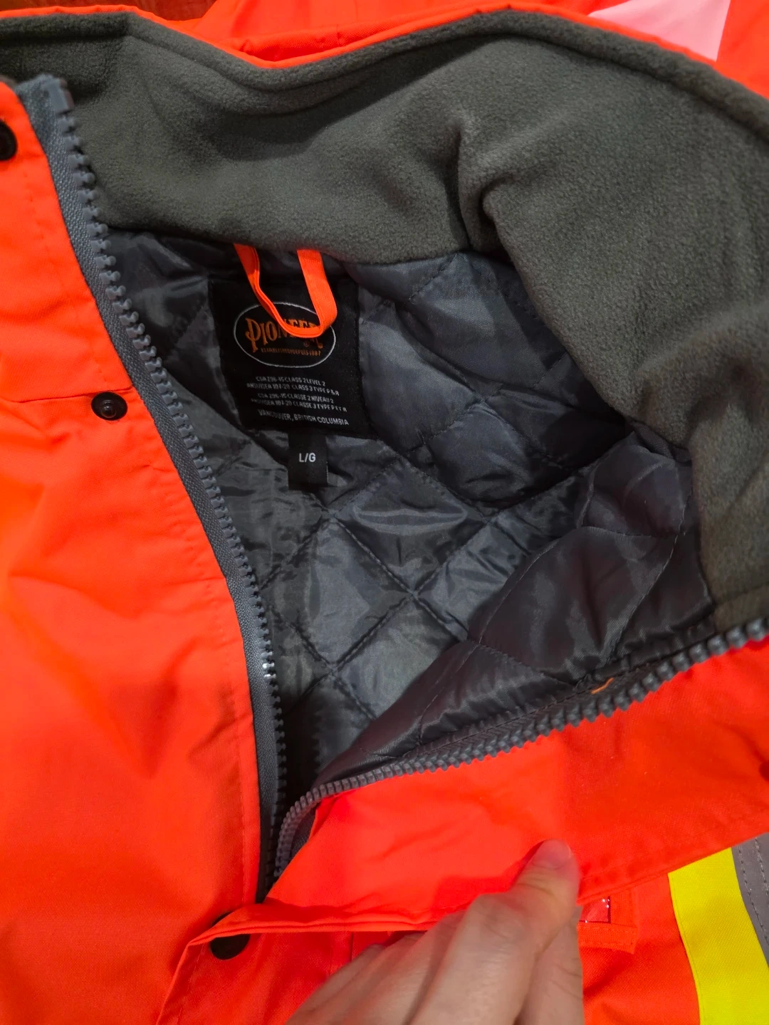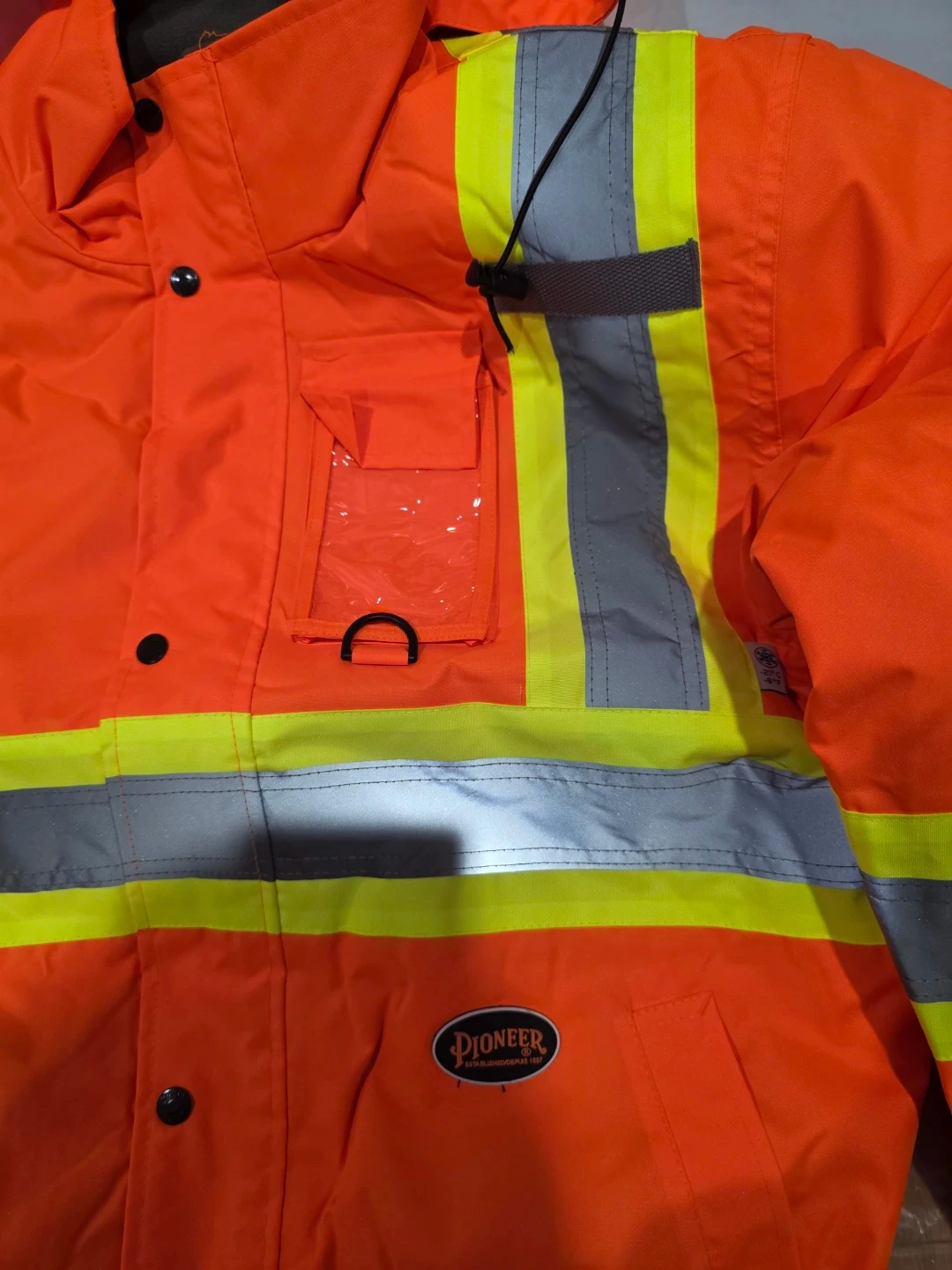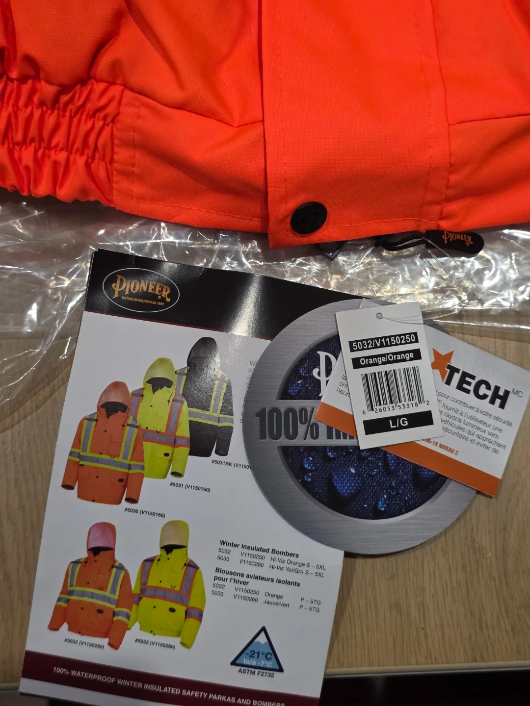 Winter insulated bomber jacket by Pioneer. It's Hi-Viz Orange. It's 100% waterproof with ASTM F2752 rating and rated for -21°C.