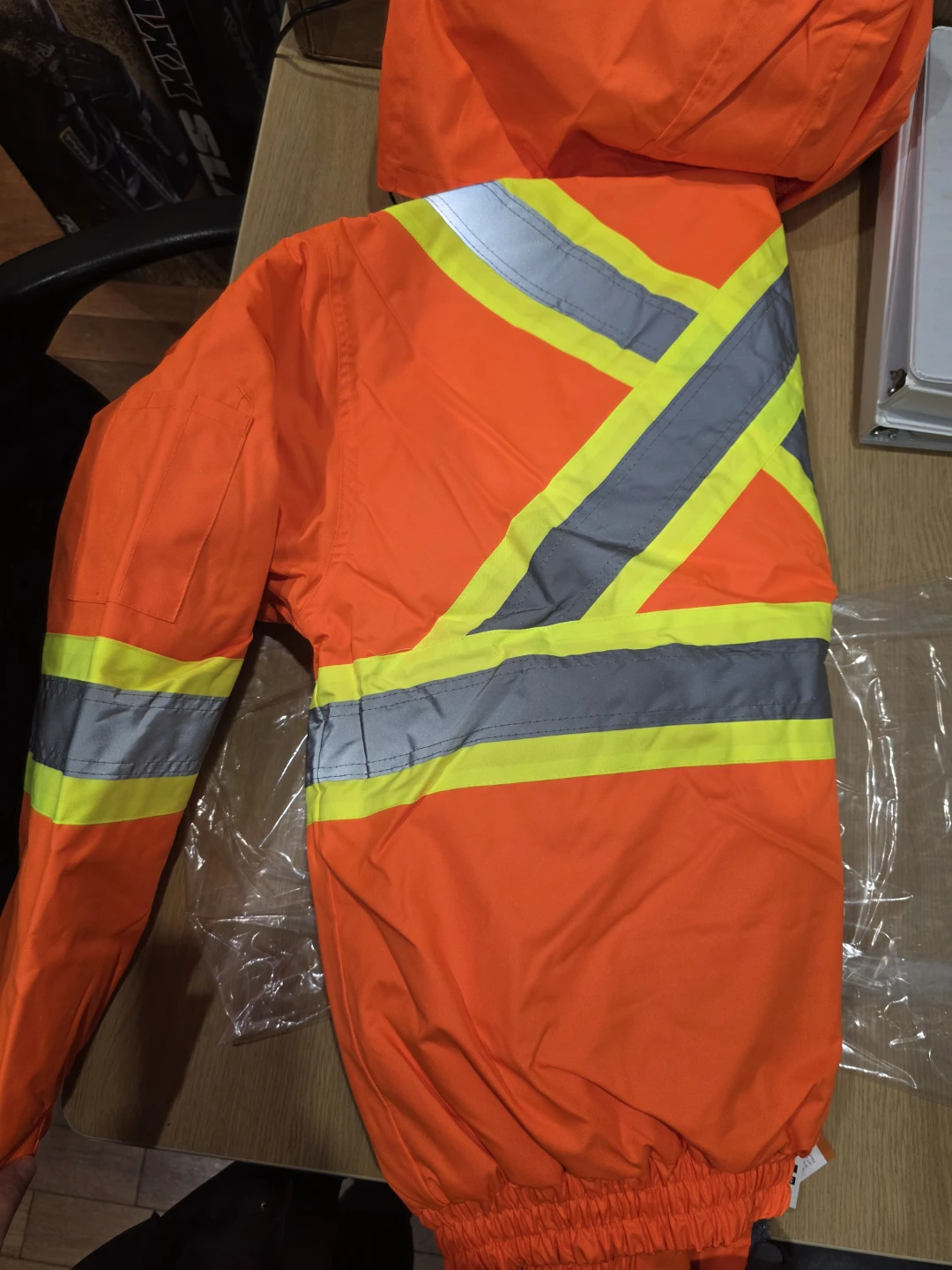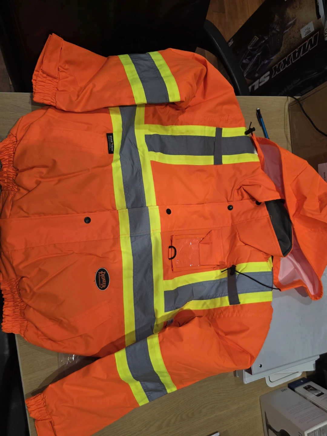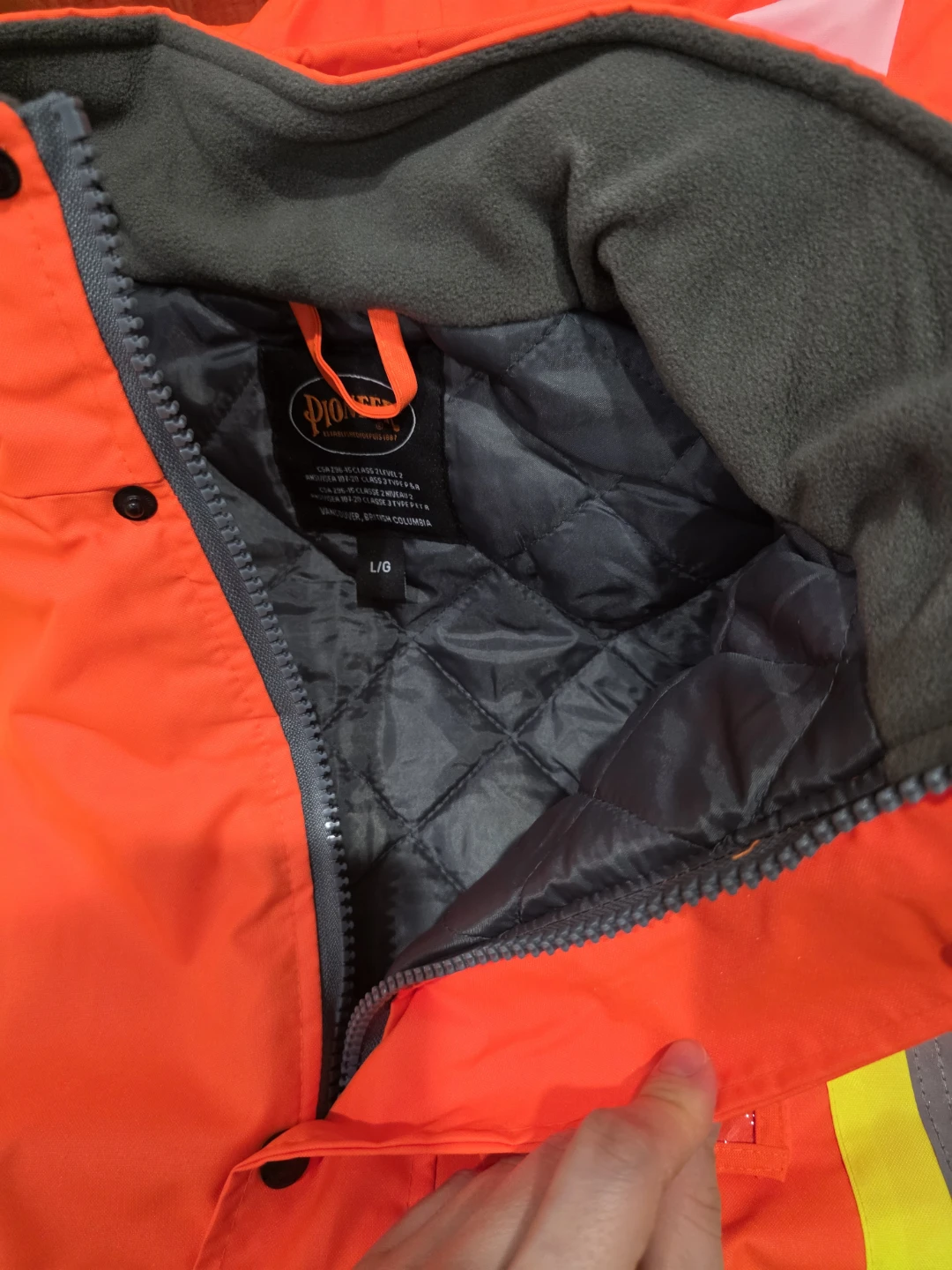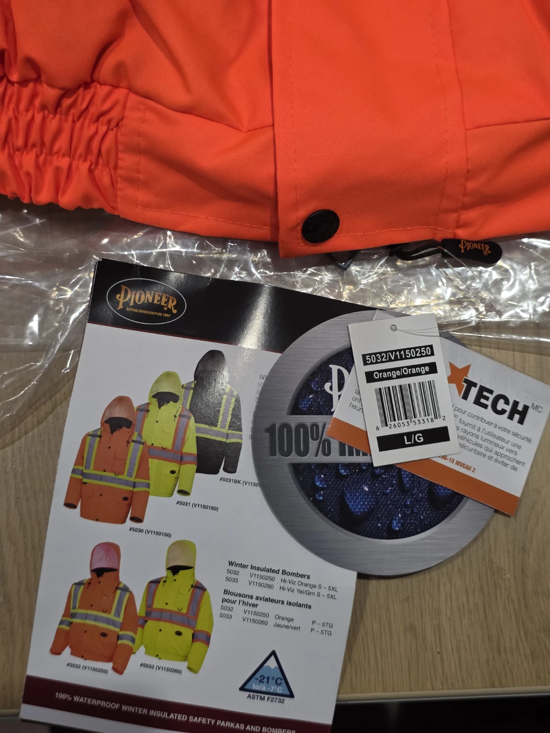 Winter insulated bomber jacket by Pioneer. It's Hi-Viz Orange. It's 100% waterproof with ASTM F2752 rating and rated for -21°C.