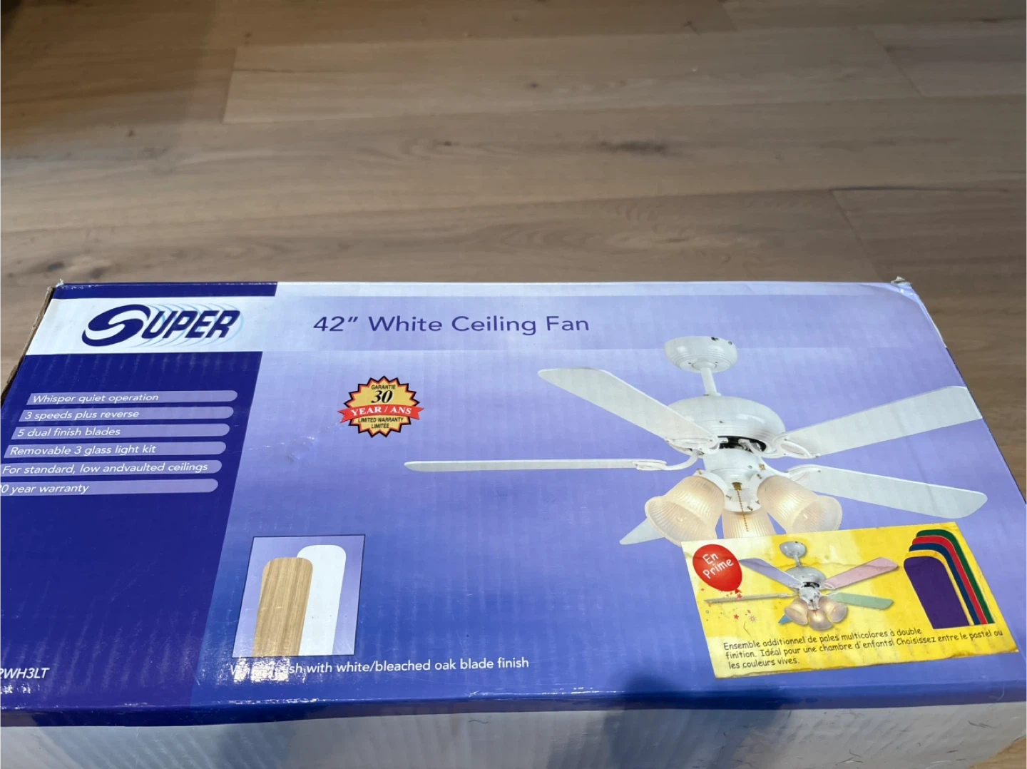 This Super ceiling fan features whisper quiet operation with 3 speeds plus reverse. It has 5 dual finish blades and a removable 3 glass light kit. It's suitable for standard, low and vaulted ceilings and comes with a 30-year warranty. Installation for standard, low and vaulted ceilings.