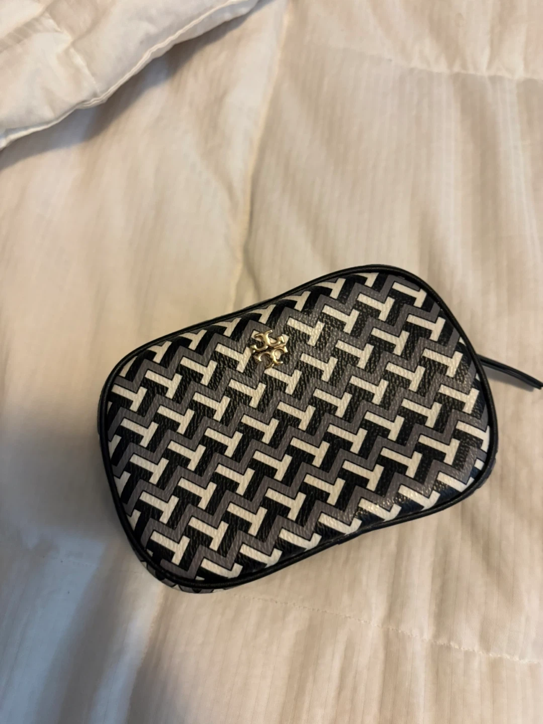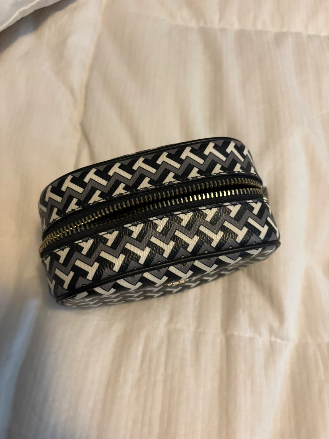 Here's a stylish Tory Burch cosmetic case! It features a unique geometric pattern in black, white, and grey with the iconic Tory Burch logo. Perfect for keeping your makeup and toiletries organized on the go