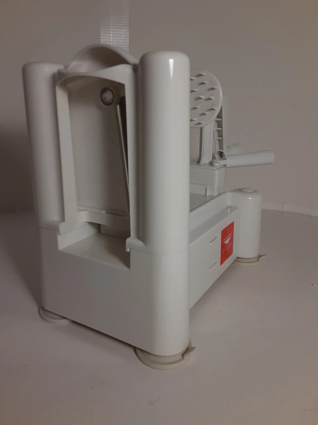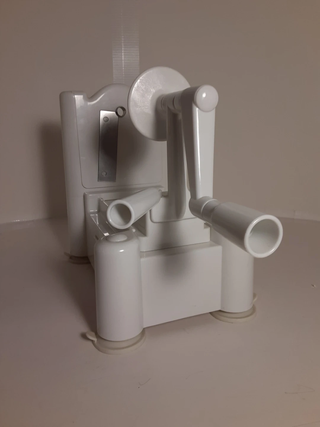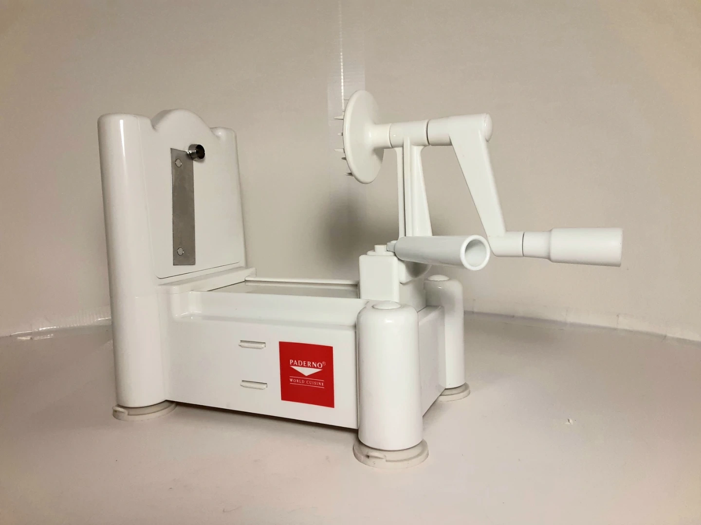 White Paderno vegetable spiralizer made of durable plastic with a crank handle for easy operation. Great for anyone looking to add more vegetables to their diet. Has been used a few times over the years but otherwise kept stored away. Shows minimal signs of age/use and is in good condition. Comes with 3 different interchangeable blades/cutting attachments that when not in use can be stored underneath.