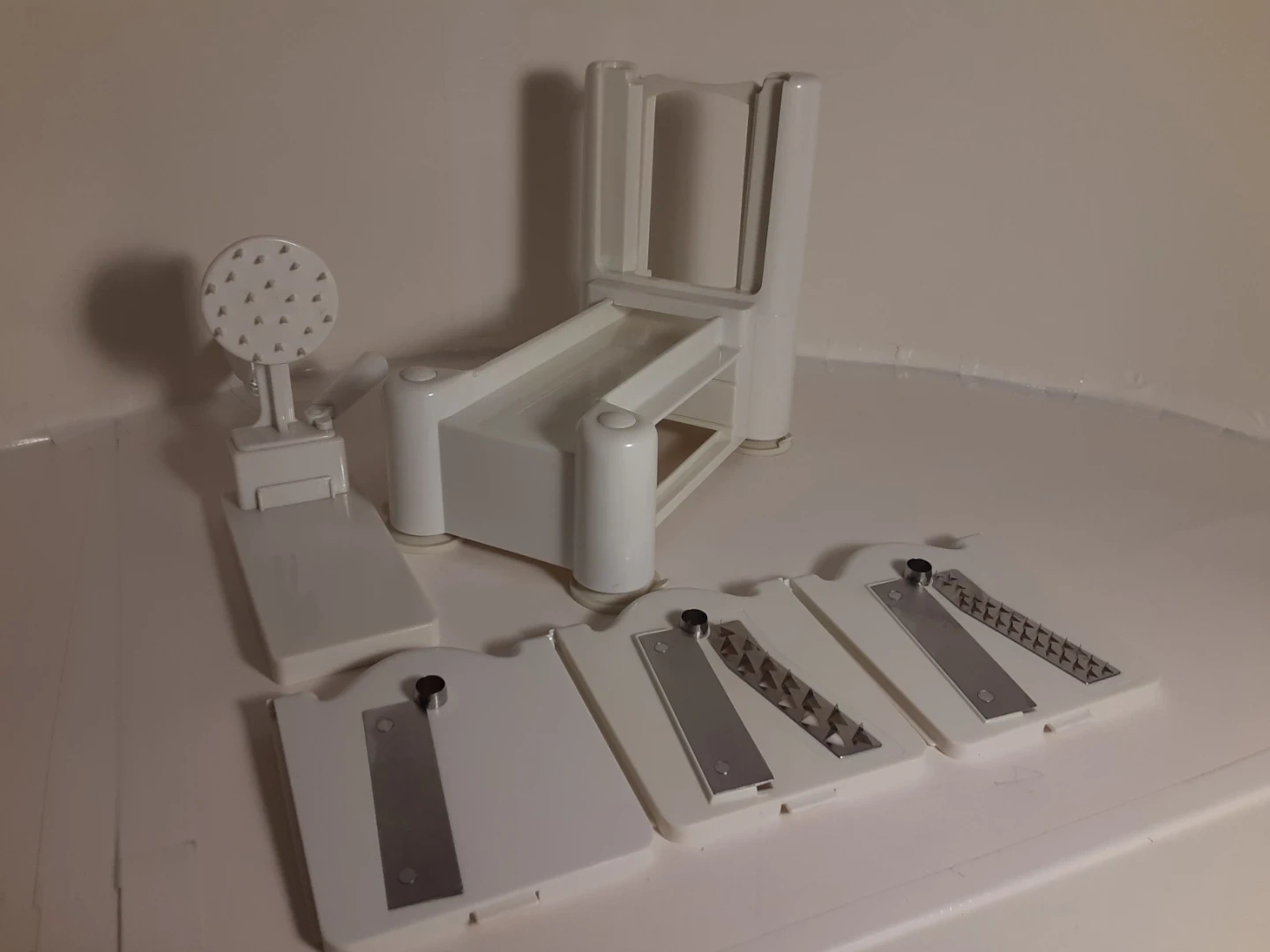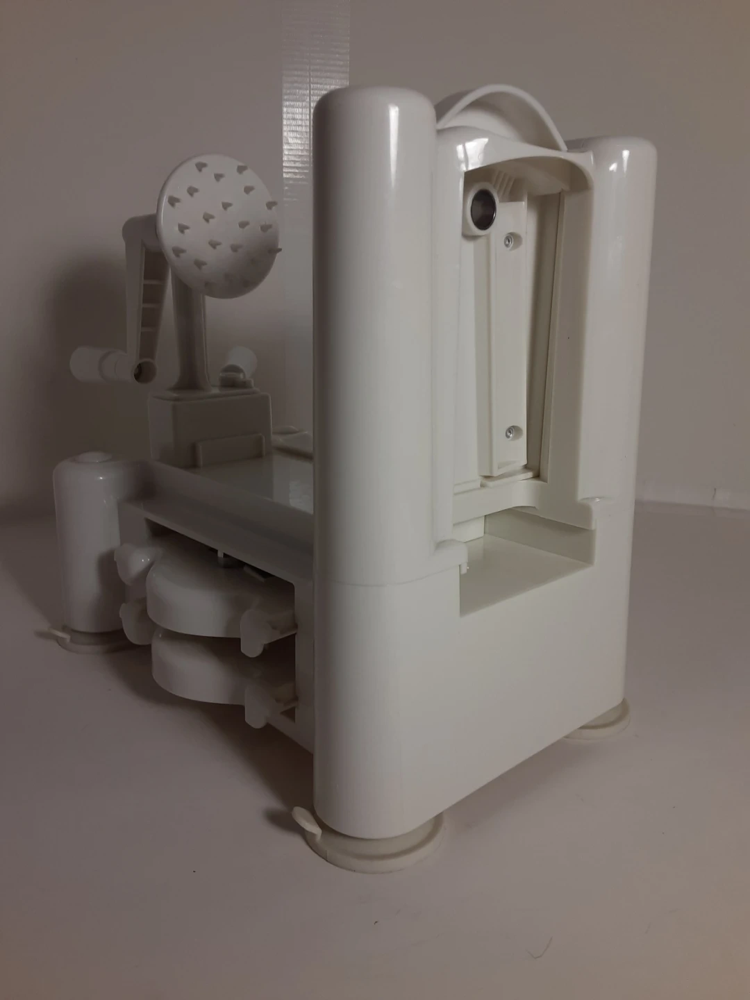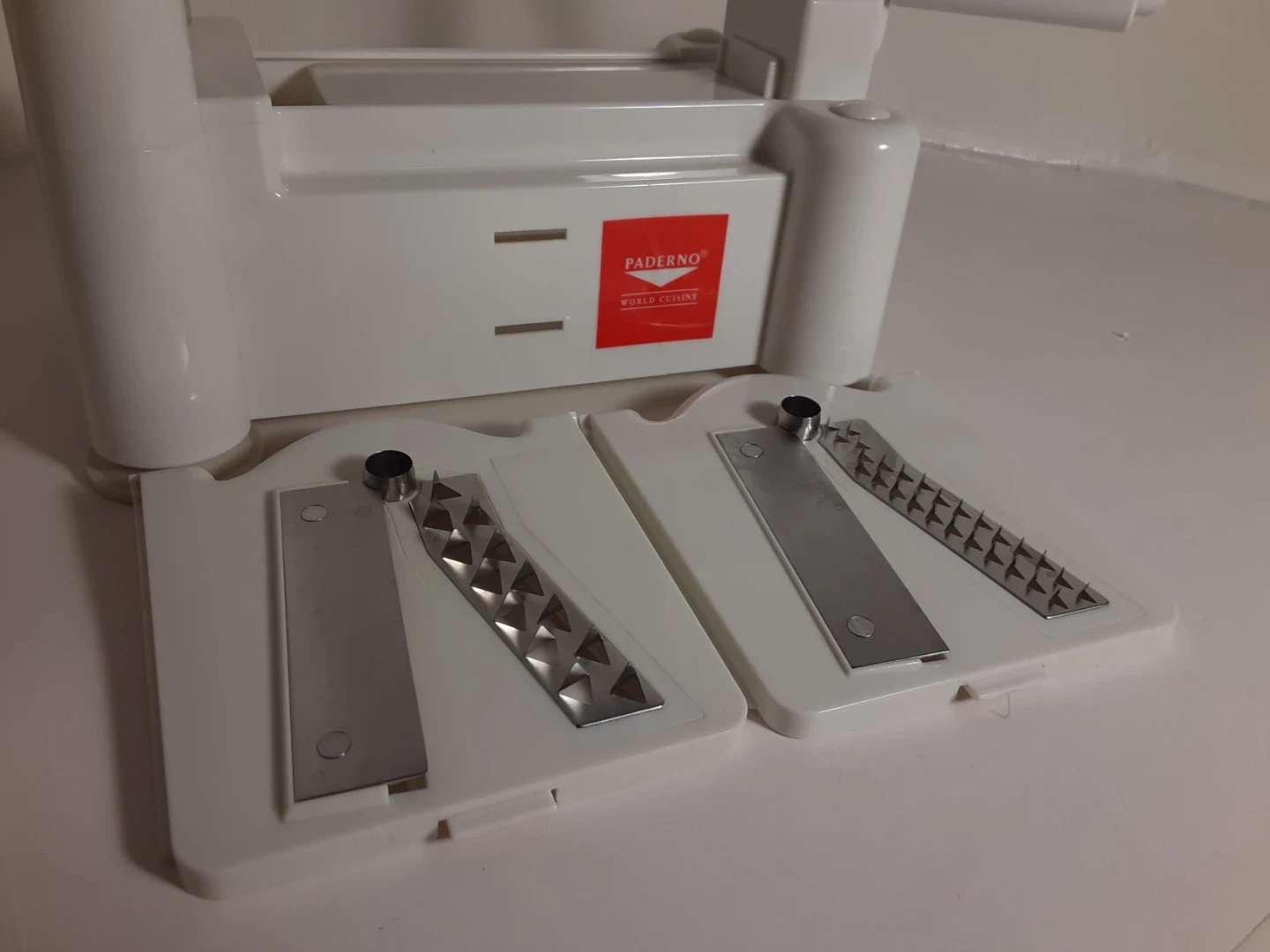 White Paderno vegetable spiralizer made of durable plastic with a crank handle for easy operation. Great for anyone looking to add more vegetables to their diet. Has been used a few times over the years but otherwise kept stored away. Shows minimal signs of age/use and is in good condition. Comes with 3 different interchangeable blades/cutting attachments that when not in use can be stored underneath.