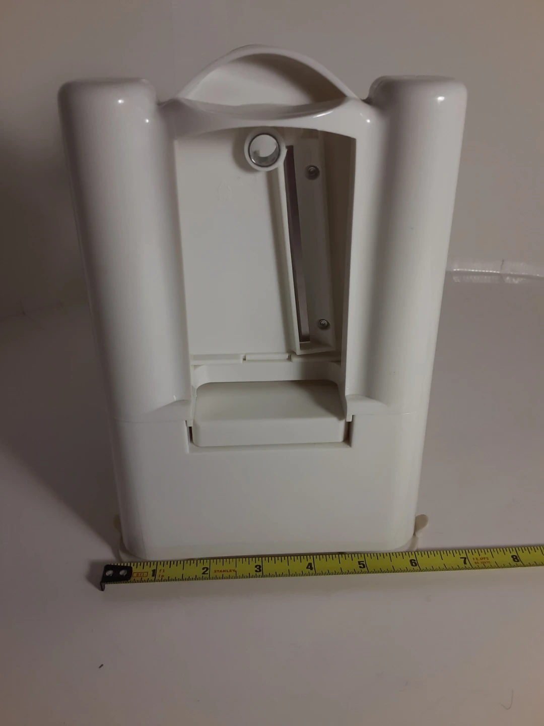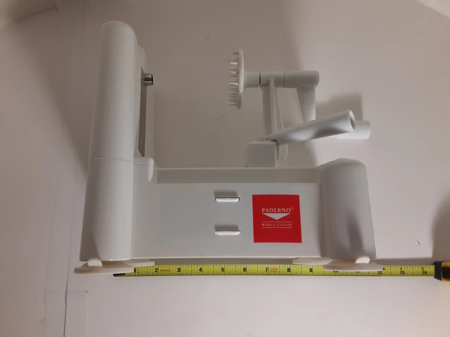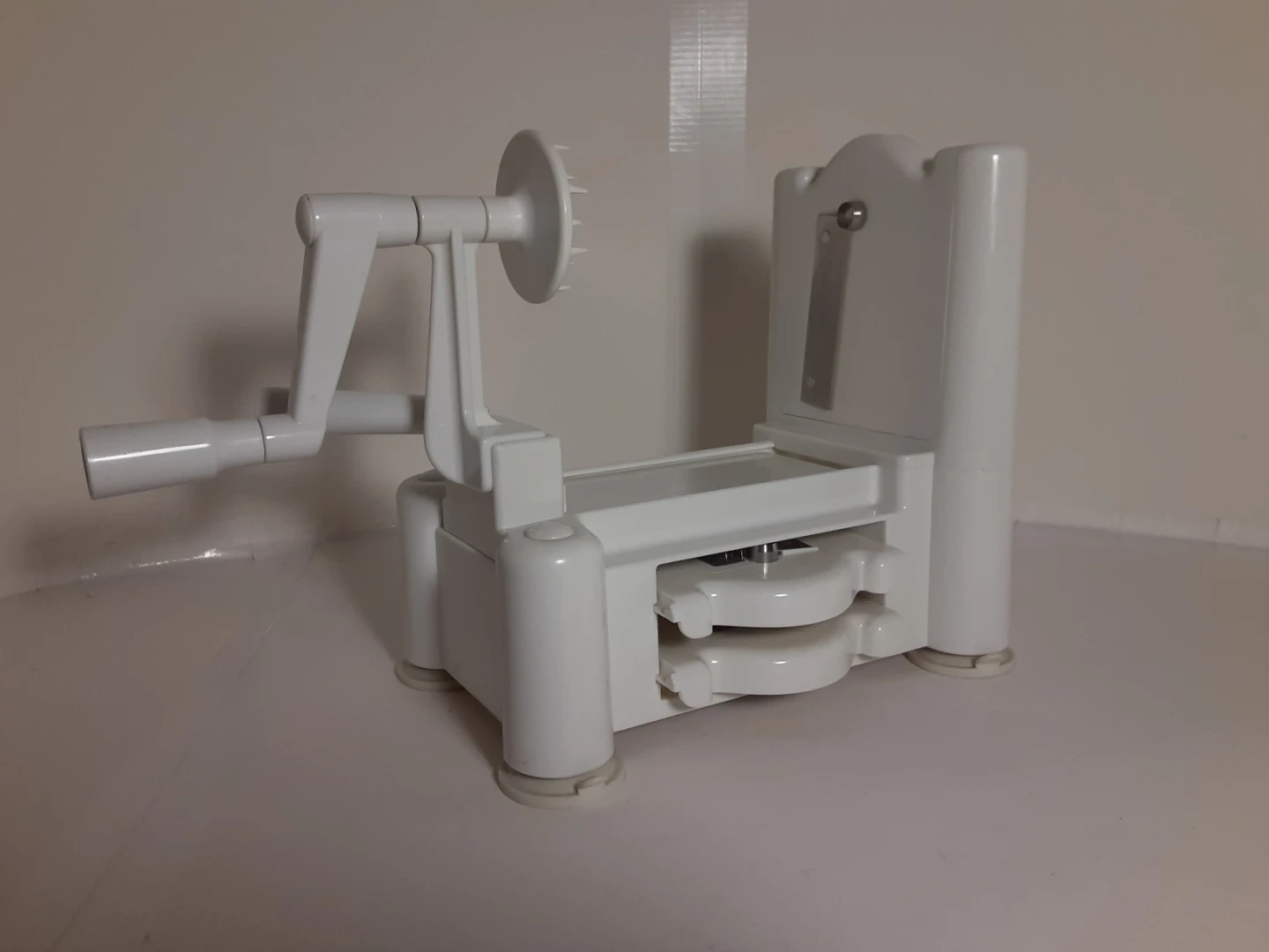White Paderno vegetable spiralizer made of durable plastic with a crank handle for easy operation. Great for anyone looking to add more vegetables to their diet. Has been used a few times over the years but otherwise kept stored away. Shows minimal signs of age/use and is in good condition. Comes with 3 different interchangeable blades/cutting attachments that when not in use can be stored underneath.