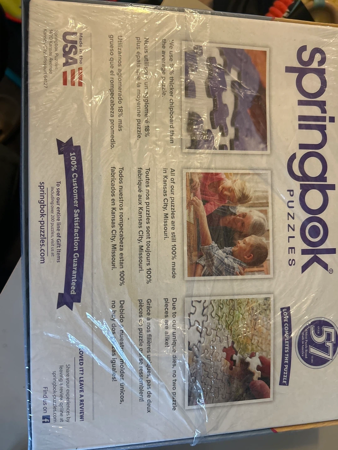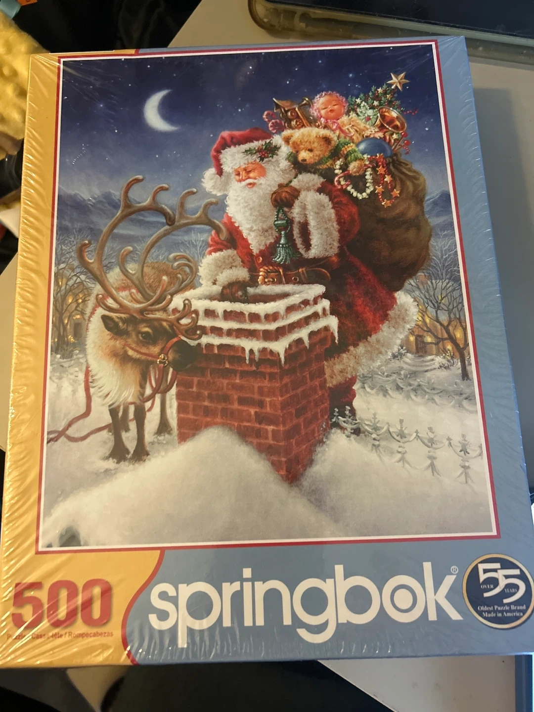 This is a Springbok 500-piece jigsaw puzzle featuring a classic Santa Claus and reindeer Christmas scene. It's made in America with thicker chipboard than the average puzzle. Enjoy assembling this festive holiday puzzle!