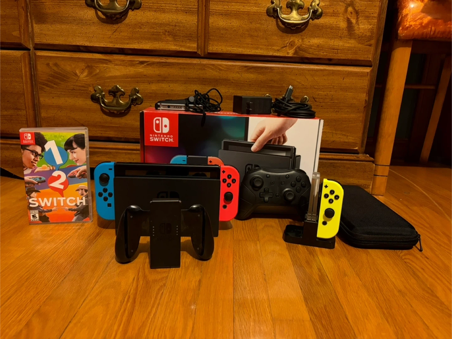 Selling a Fully Working Nintendo Switch console with neon, blue and red Joy-Cons. It comes with the original box, dock, Game carrying case, Nintendo Switch Pro Controller, and a carrying case. Also includes the '1-2 Switch' game.