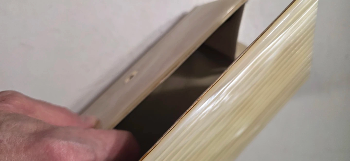A stylish vintage clutch purse in a cream, swirling pearlescent material. It's a compact size, perfect for carrying essentials. This unique accessory would be great for evening events or adding a touch of retro flair to any outfit!