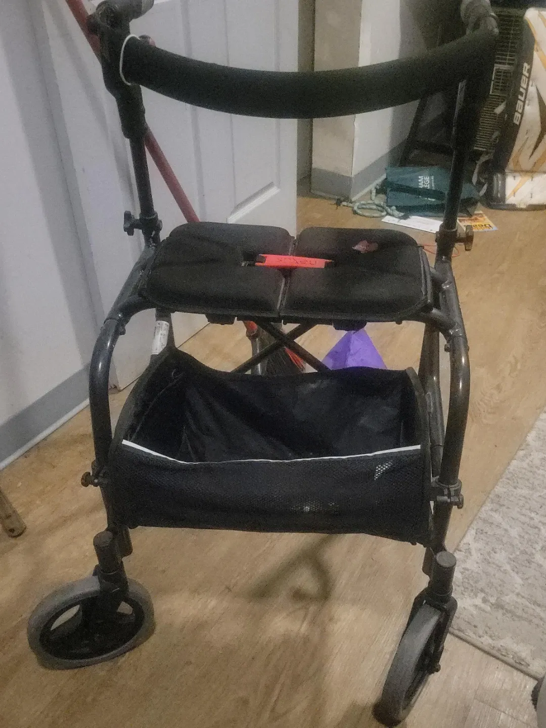 This mobility walker features a comfortable seat and a convenient storage basket. Its sturdy frame provides reliable support. It's designed for ease of use and maneuverability. A great tool for anyone needing a bit of extra assistance getting around!