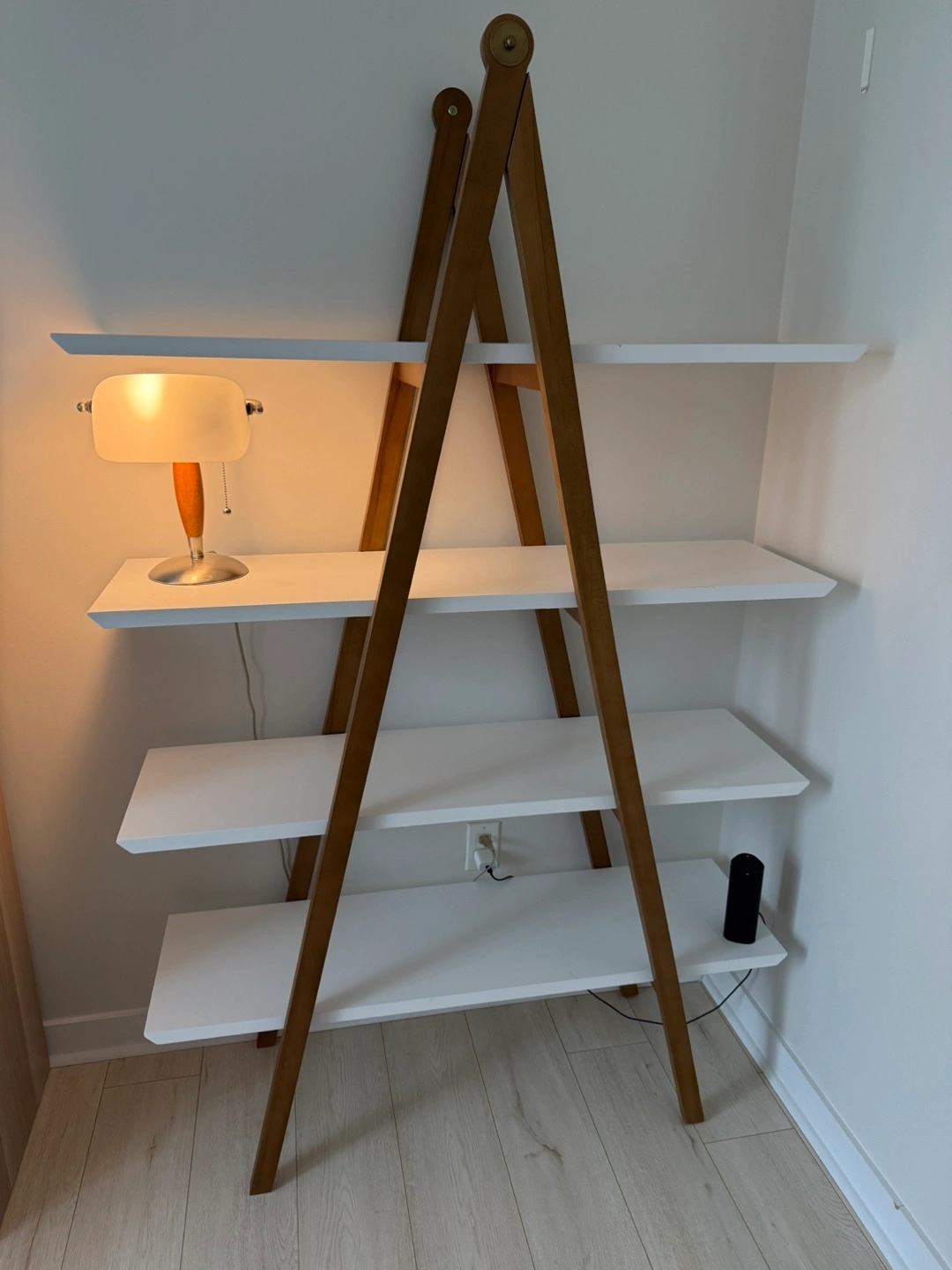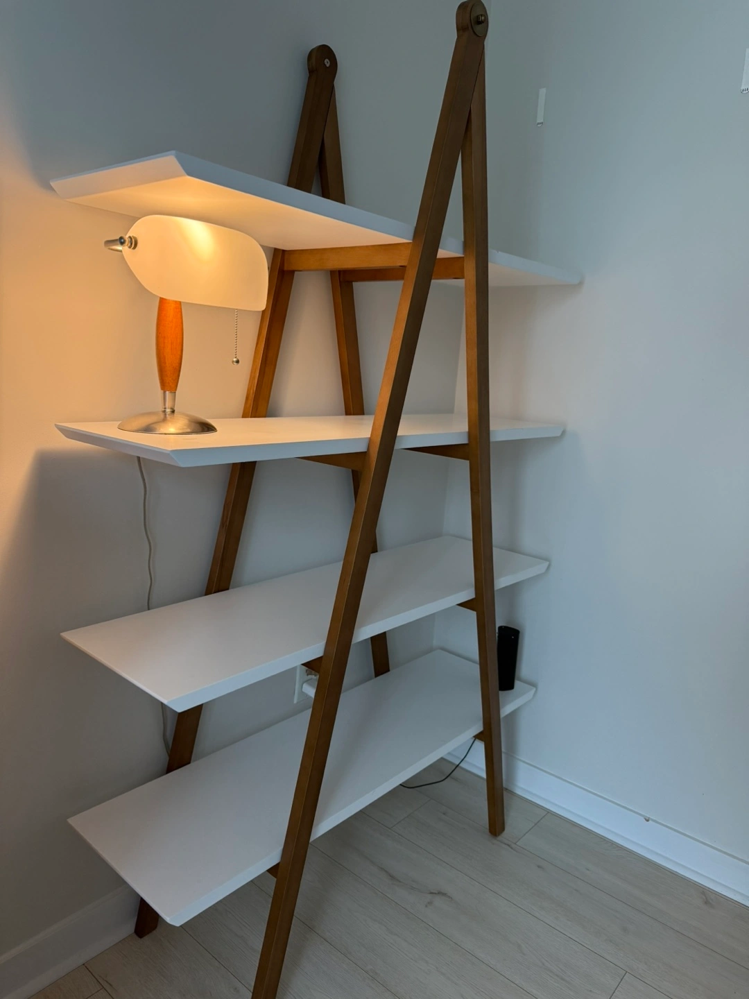 Four-shelf ladder bookcase. White shelves and brown wood frame. Great condition. Assembly required.