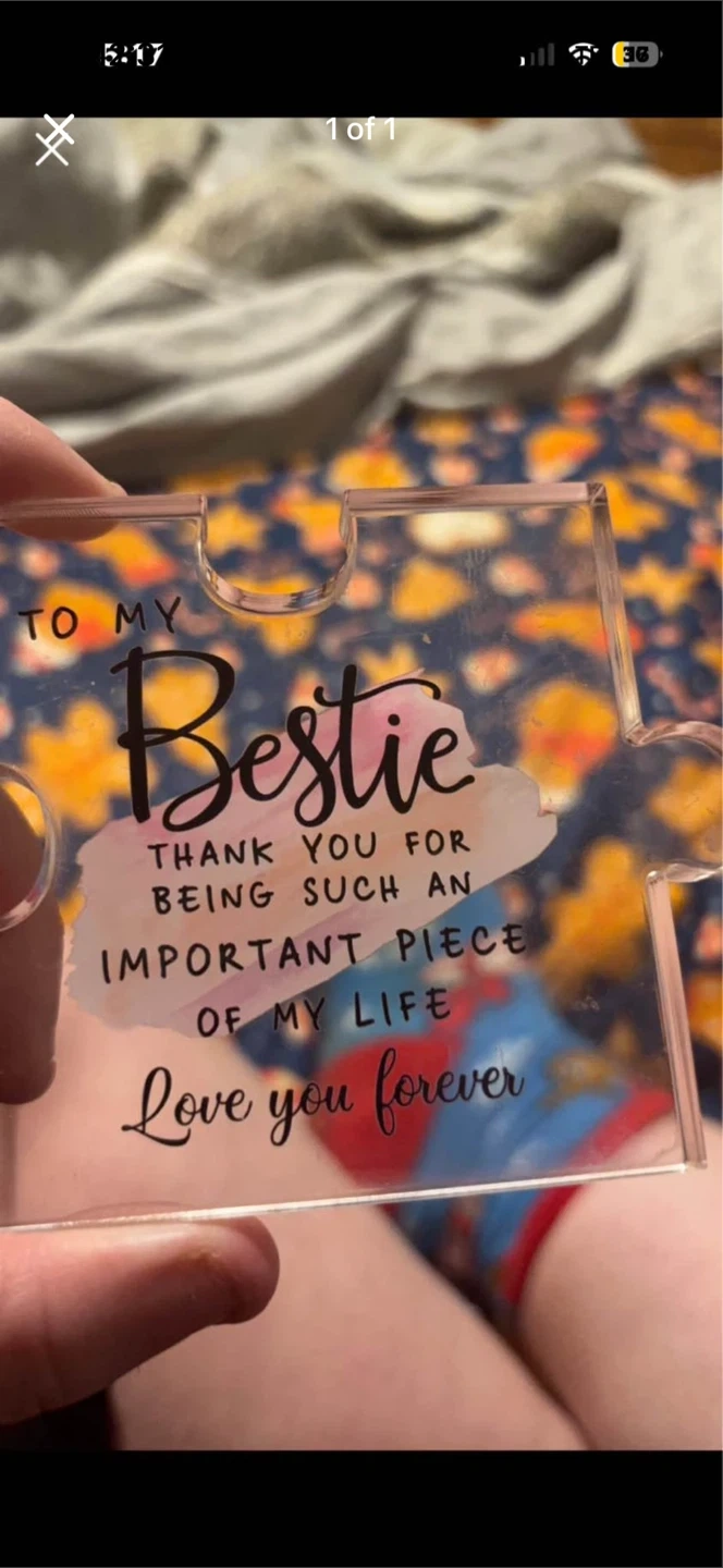 This clear acrylic puzzle piece keepsake reads 'To My Bestie, Thank You For Being Such An Important Piece Of My Life, Love You Forever'. It's a thoughtful gift for your best friend. This item is made of clear acrylic.
