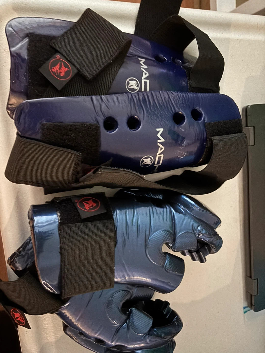 Selling a set of blue Mach martial arts protective gear, including shin guards and hand mitts. It's made of durable synthetic material with adjustable straps for a secure fit. This set is suitable for training and sparring.