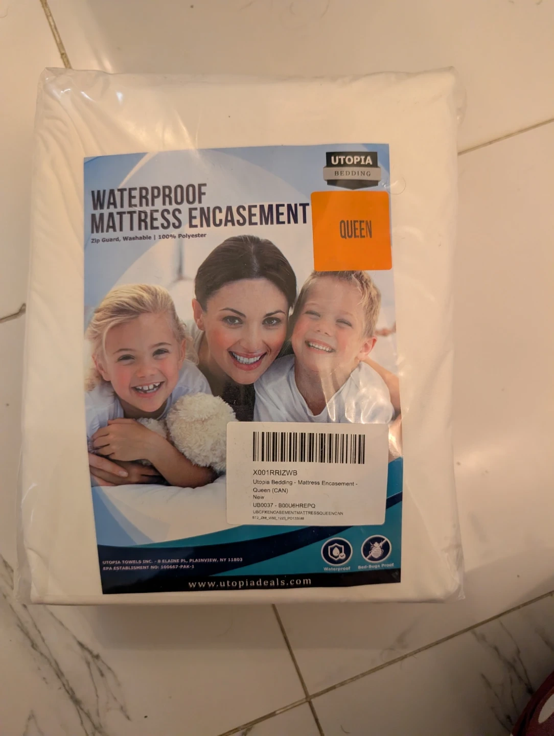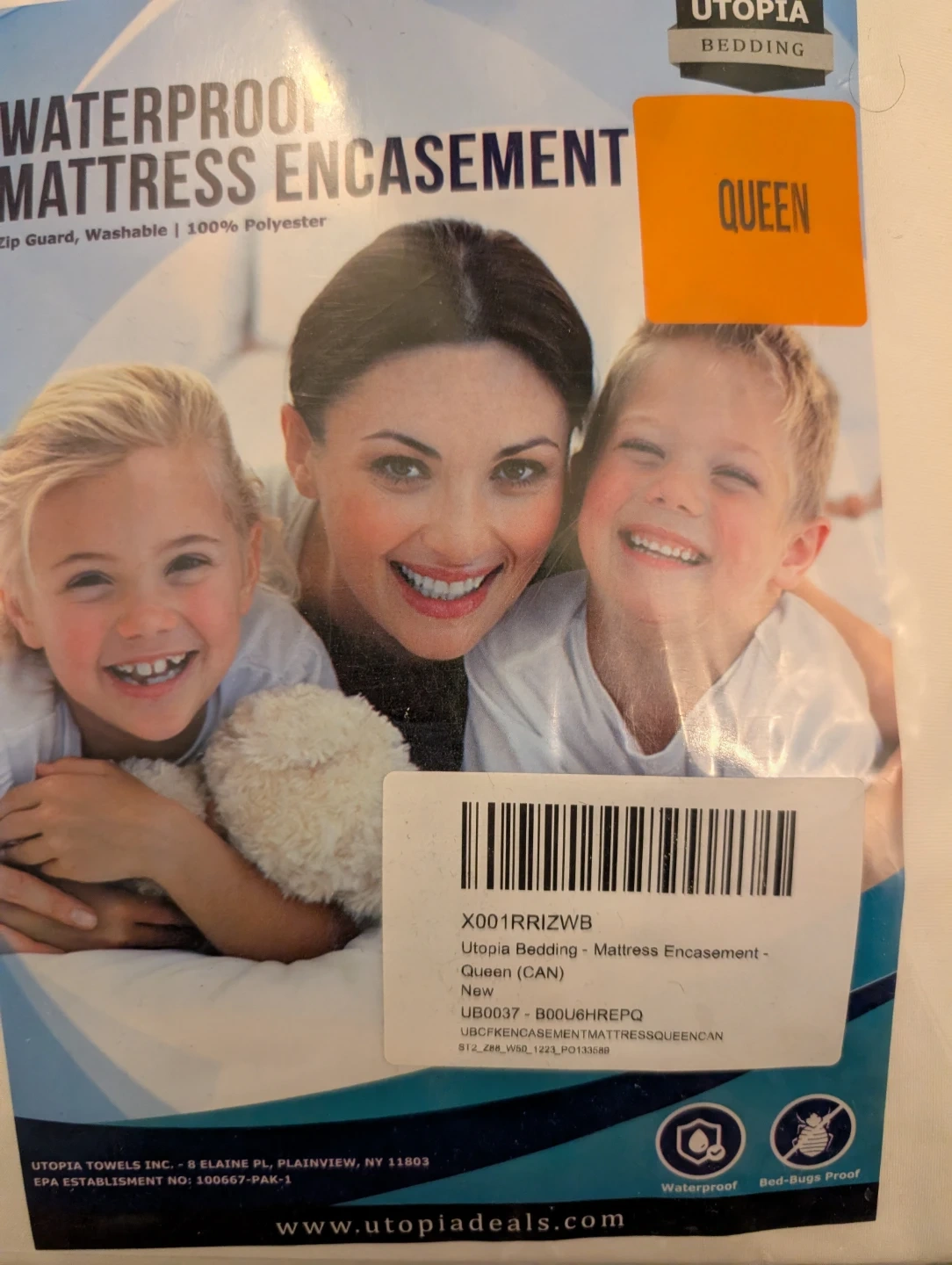 This is a queen-sized waterproof mattress encasement from Utopia Bedding. It's made of 100% polyester with a zip guard closure. It's also bed-bug proof!