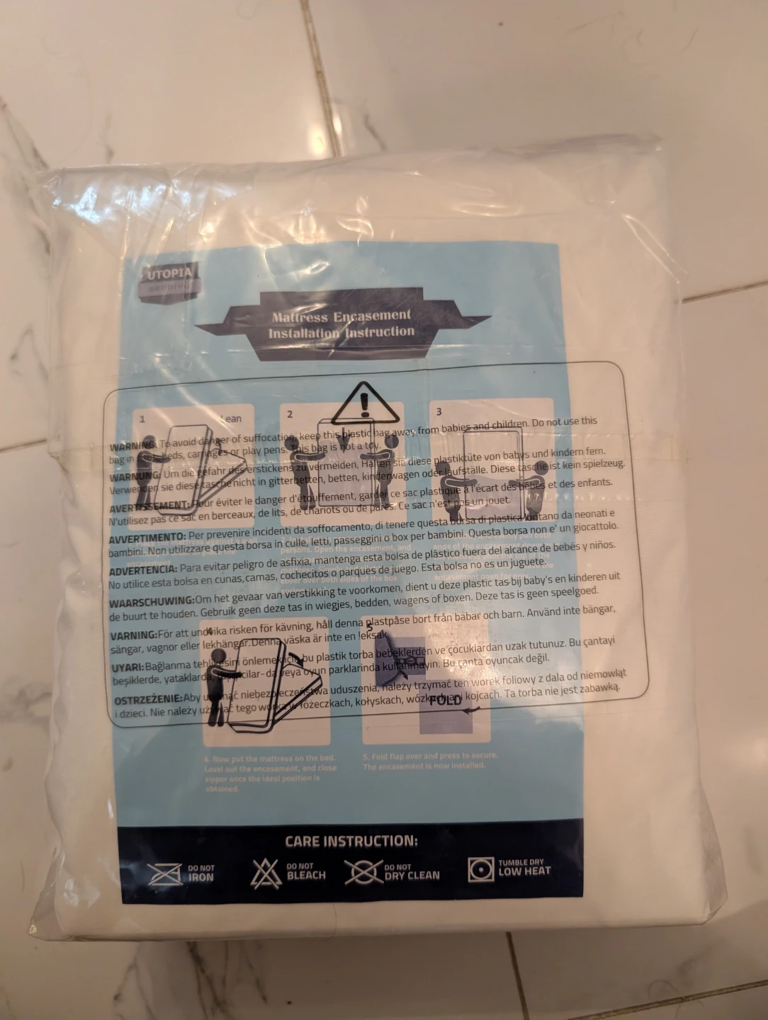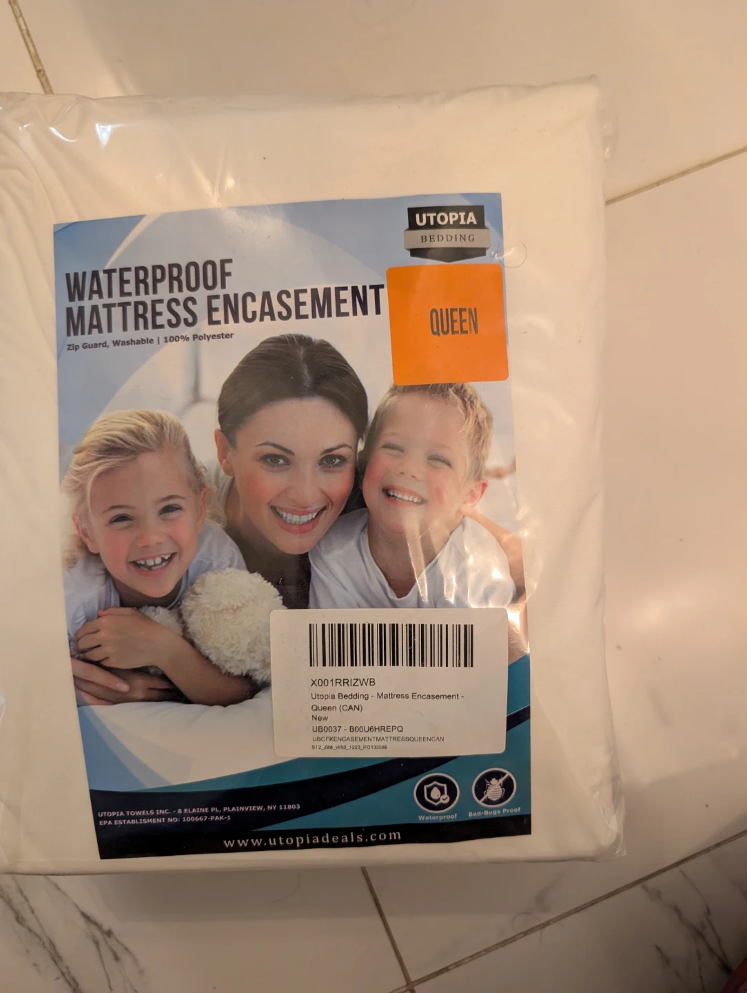 This is a queen-sized waterproof mattress encasement from Utopia Bedding. It's made of 100% polyester with a zip guard closure. It's also bed-bug proof!