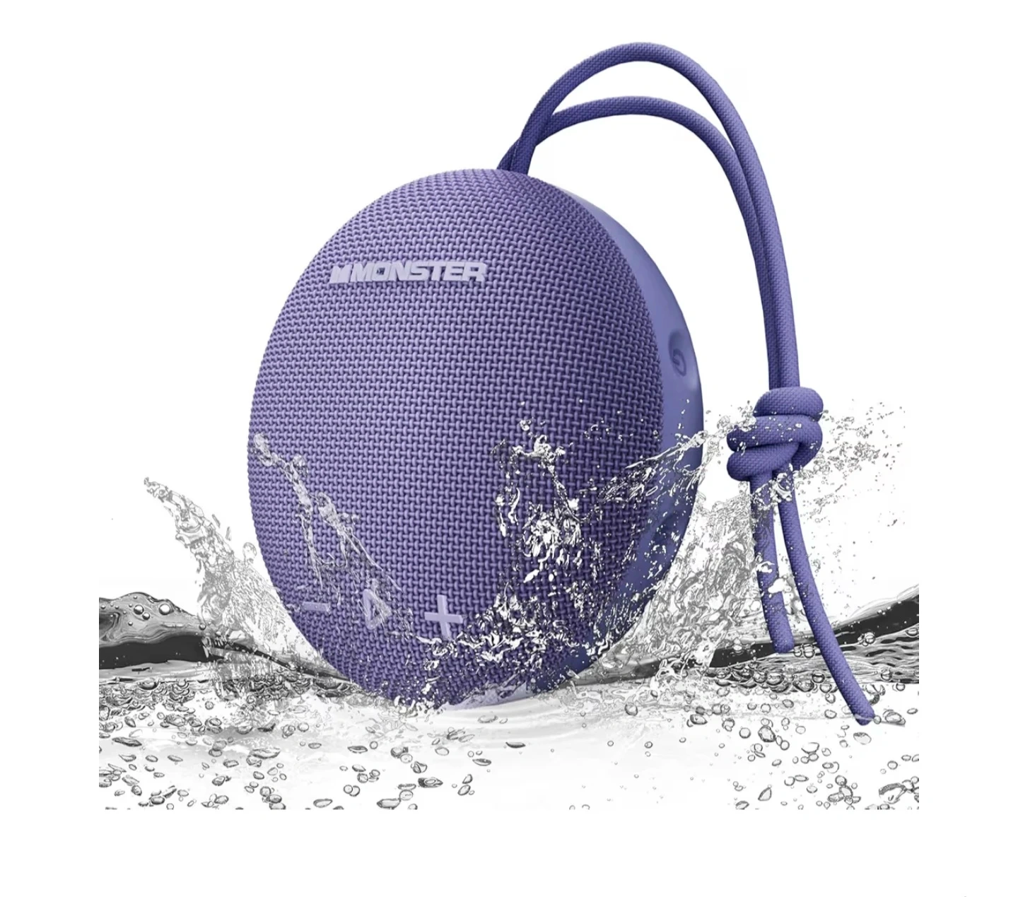This is a Monster portable speaker in a vibrant purple colour. It's designed to be waterproof, making it great for outdoor use. It comes with a convenient carrying loop attached.