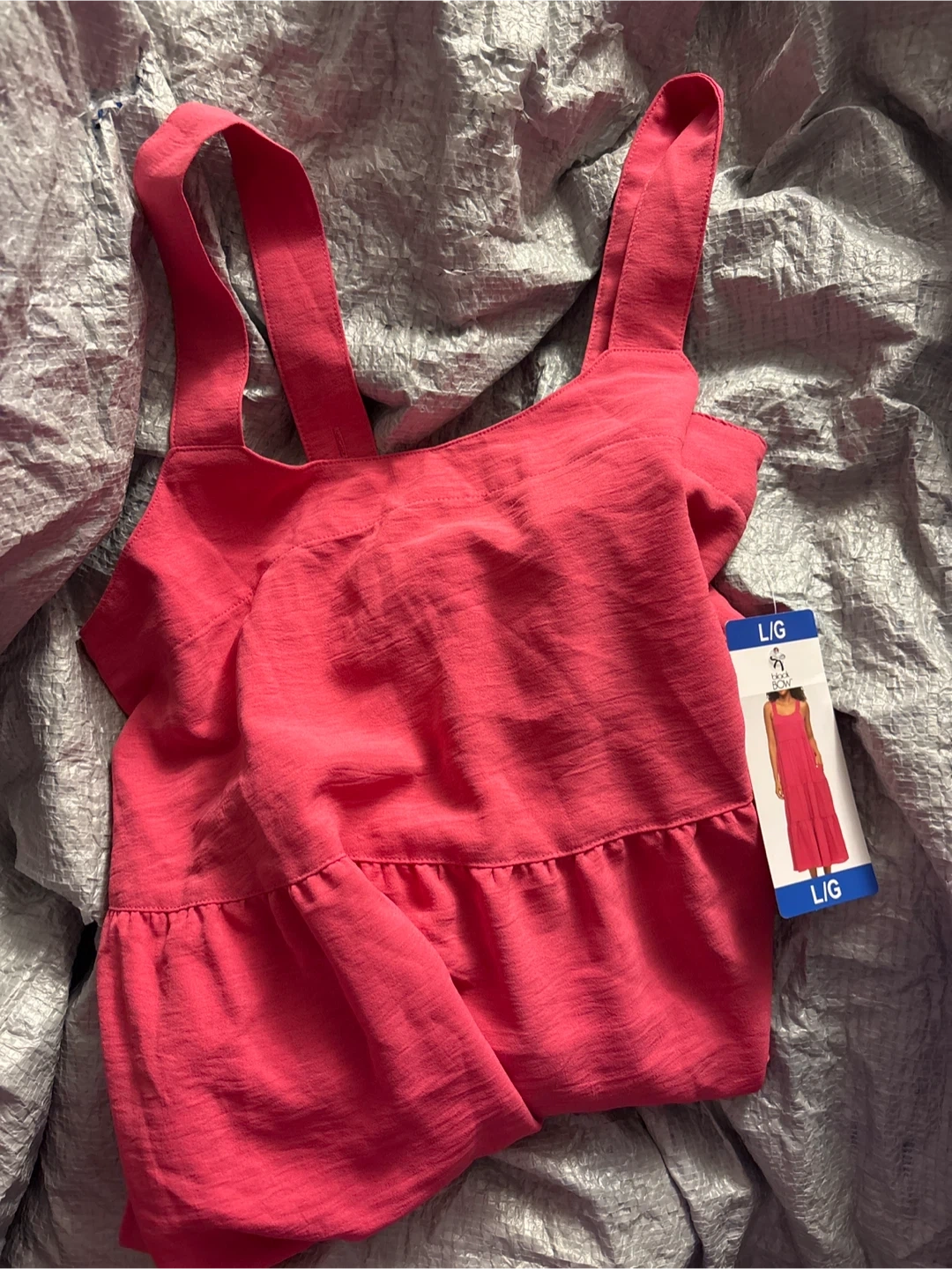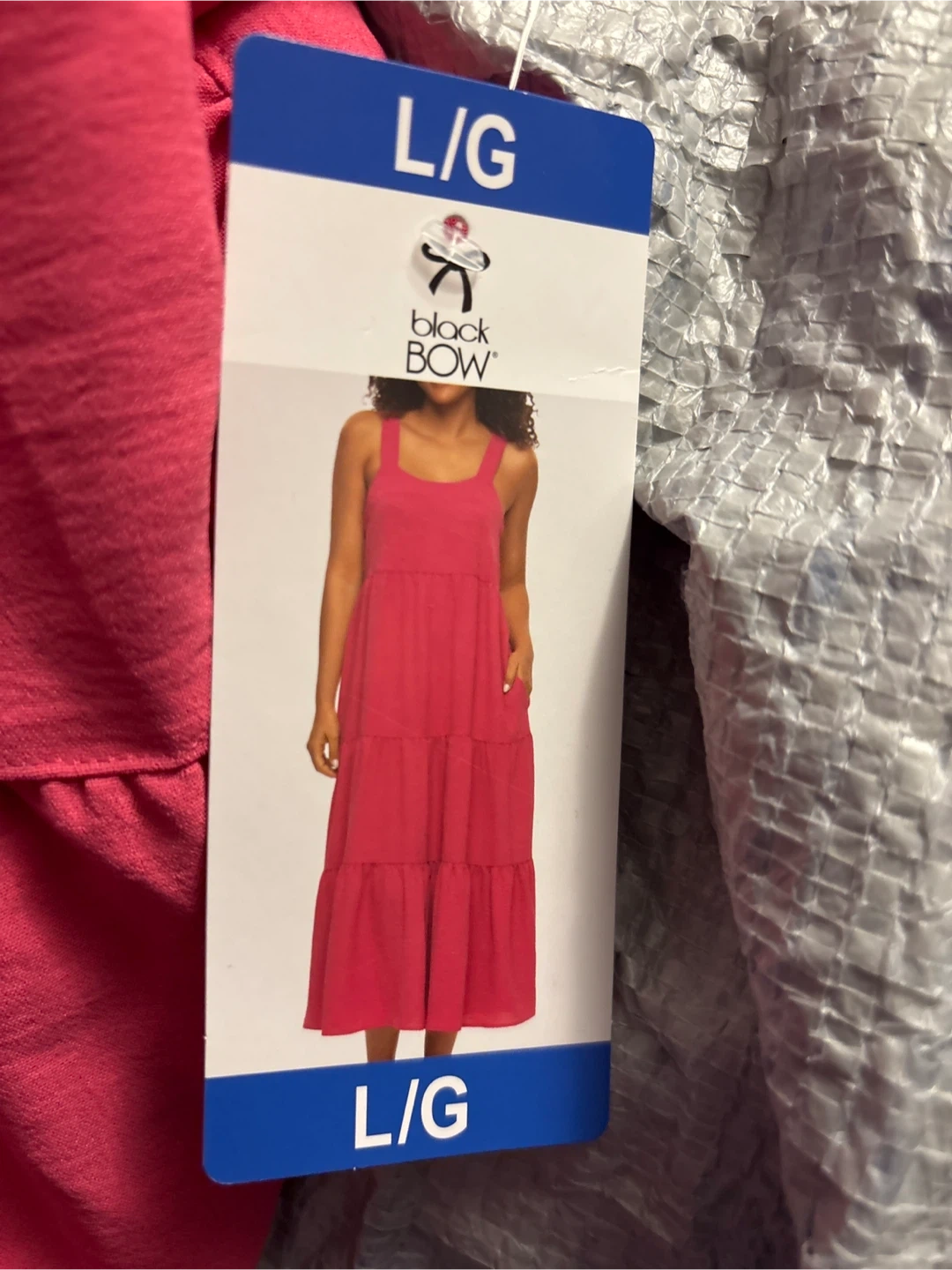 A vibrant pink, tiered maxi dress from Black Bow. It's a size L/G with a relaxed fit. This dress is perfect for warm weather outings!