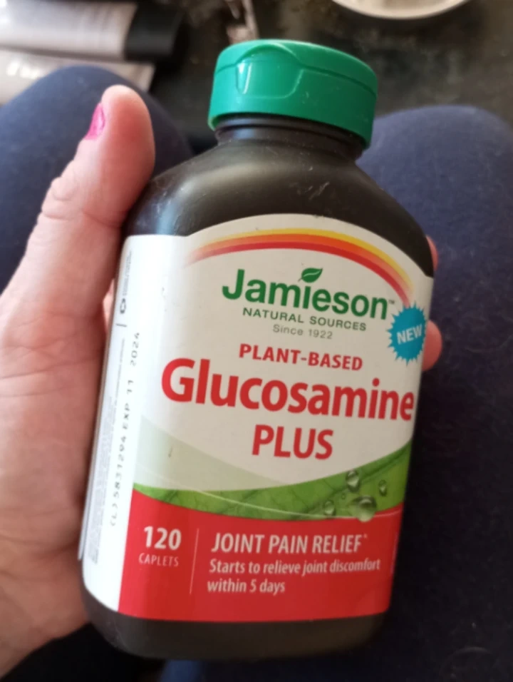 Jamieson Plant-Based Glucosamine Plus caplets offer joint pain relief. Starts to relieve joint discomfort within 5 days. Includes 120 caplets per bottle. EXP 2024 11.