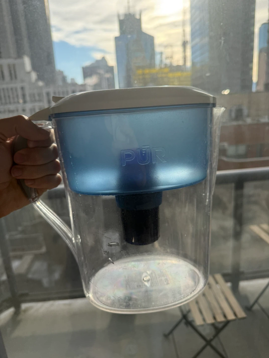 This is a PŪR water filter pitcher with a blue lid and clear body. It includes the filter. It's ready for your kitchen sink!
