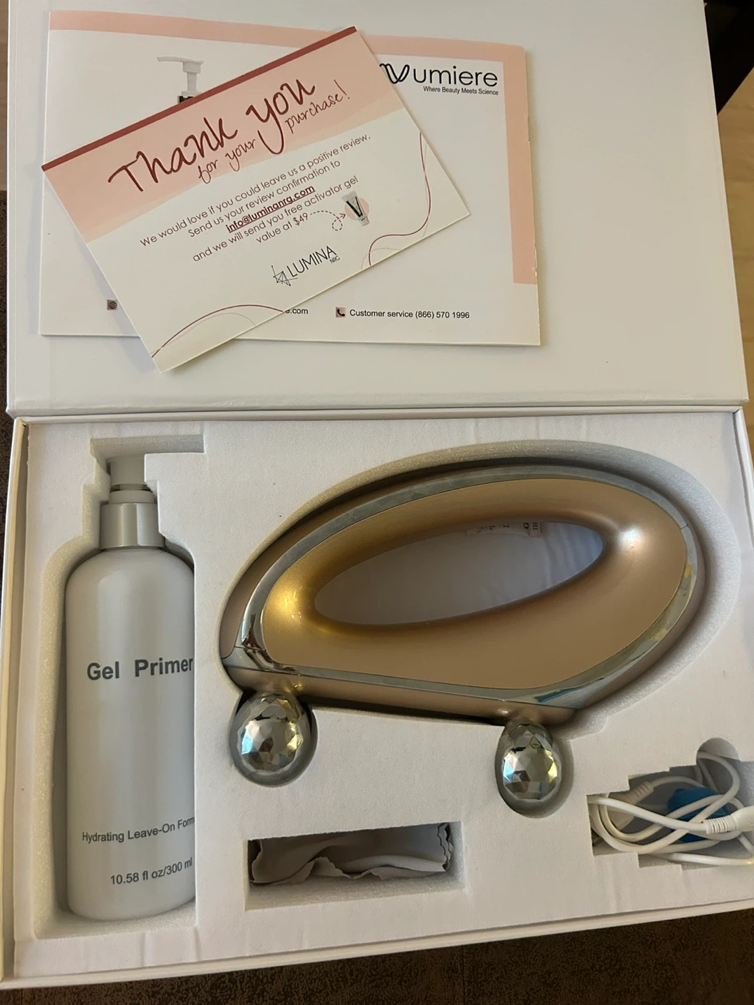 This NuMiere device is designed to reduce cellulite and tone the body. 300ml Gel Primer and charging cable included!