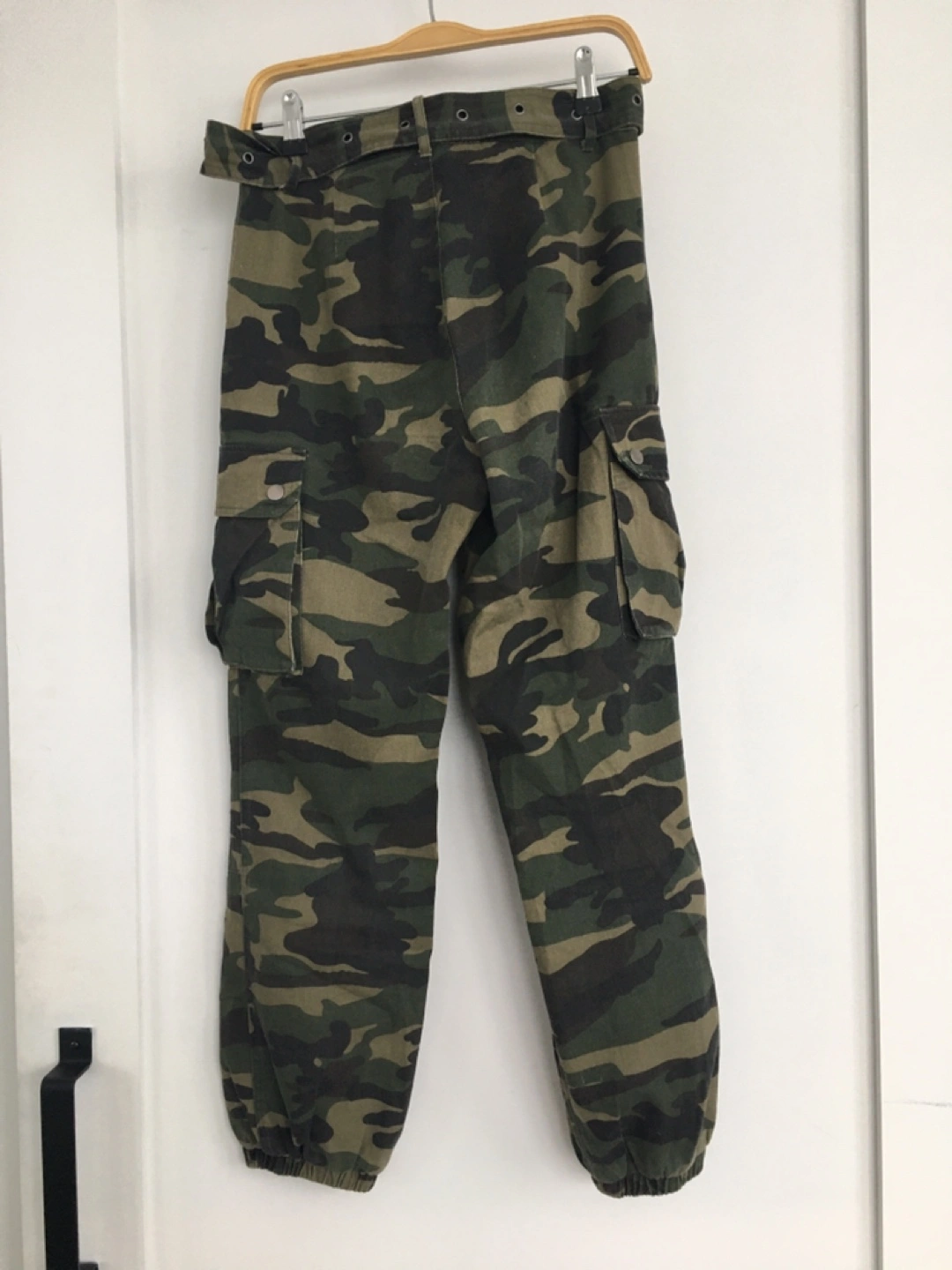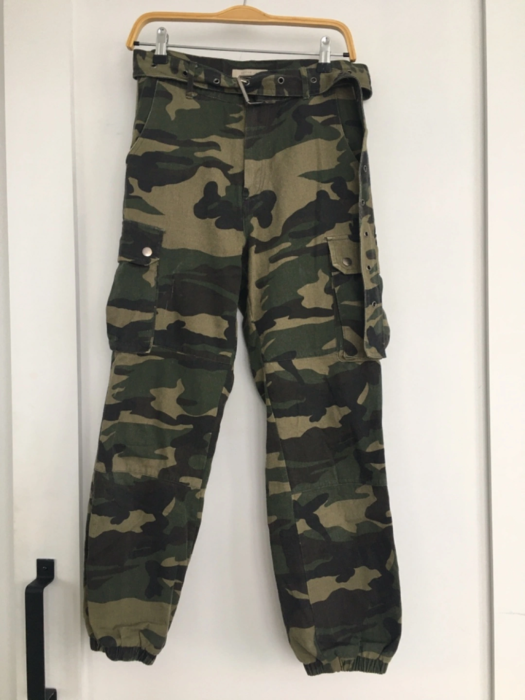 These are Active USA camouflage cargo pants. Size is small. High waist fit with matching belt.