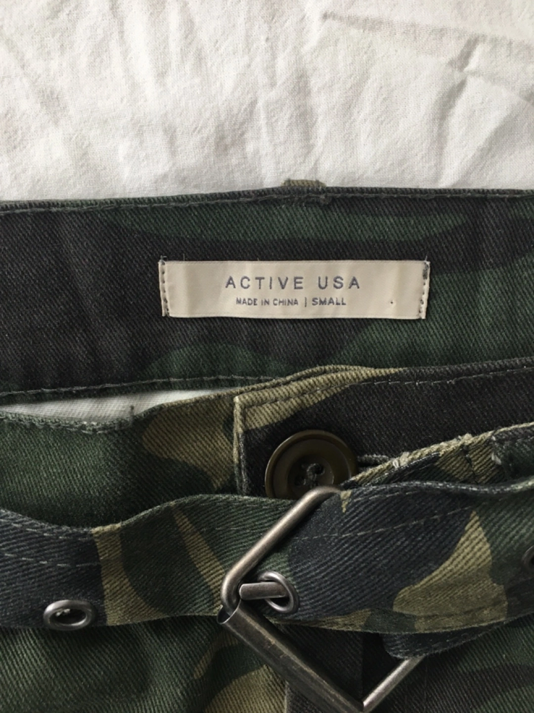 These are Active USA camouflage cargo pants. Size is small. High waist fit with matching belt.