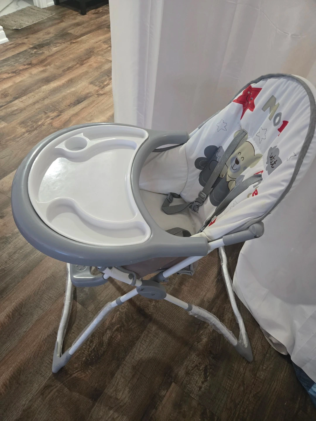This baby high chair is designed for your little one. It features a comfortable, padded seat with a 5-point harness for safety. The tray is removable for easy cleaning. It's perfect for mealtime with your baby.