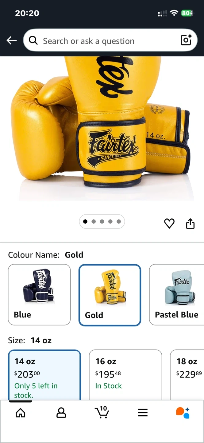 These Fairtex boxing gloves are gold coloured and 14 oz. They're made for training or sparring. Perfect for martial arts practitioners!