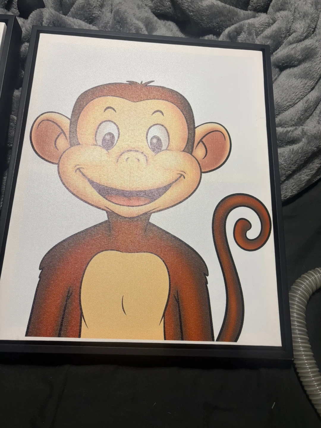 This set includes two framed canvas prints, one featuring a cheerful monkey and the other a friendly lion. Both pieces have black frames and are ready to hang. They're perfect for adding a touch of fun to a child's room!