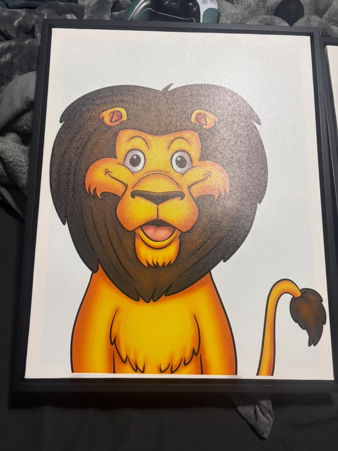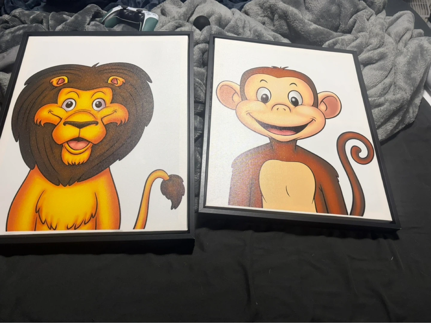 This set includes two framed canvas prints, one featuring a cheerful monkey and the other a friendly lion. Both pieces have black frames and are ready to hang. They're perfect for adding a touch of fun to a child's room!