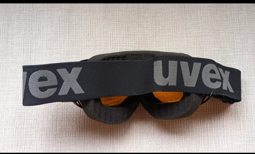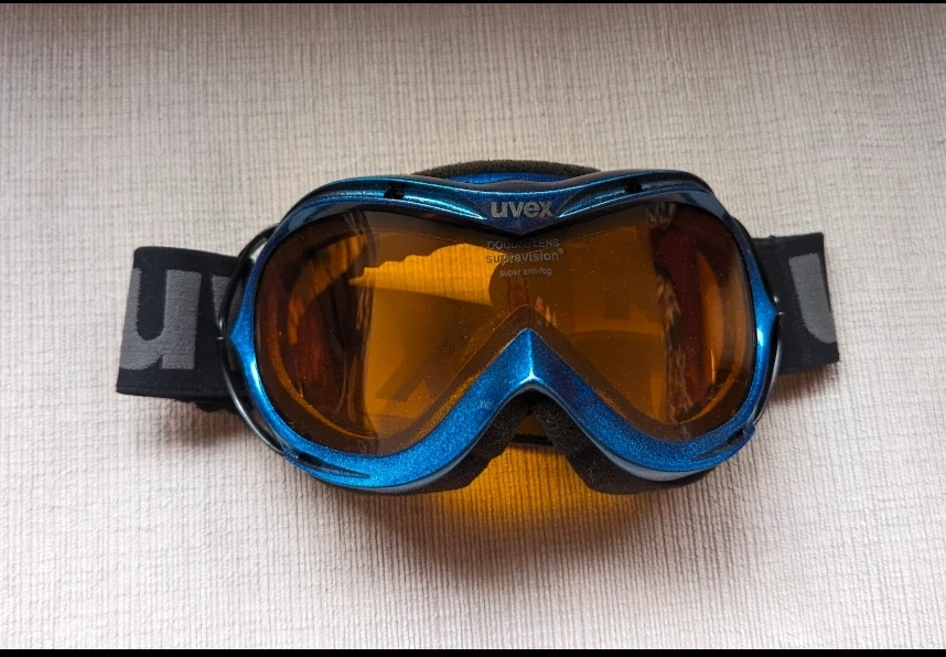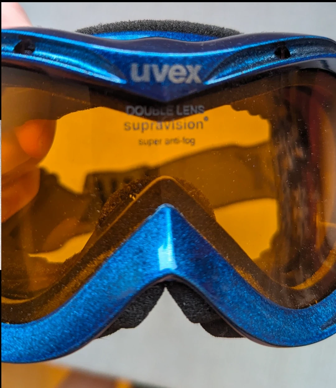 Uvex ski goggles with a double lens and Supravision super anti-fog coating. The frame is blue with a black strap featuring the Uvex logo. These are suitable for winter sports.