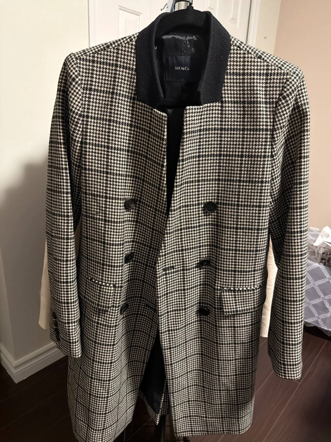 Houndstooth double-breasted coat from MO&Co. It has a black collar and double-breasted button closure. This coat's pattern makes it a versatile layering piece.