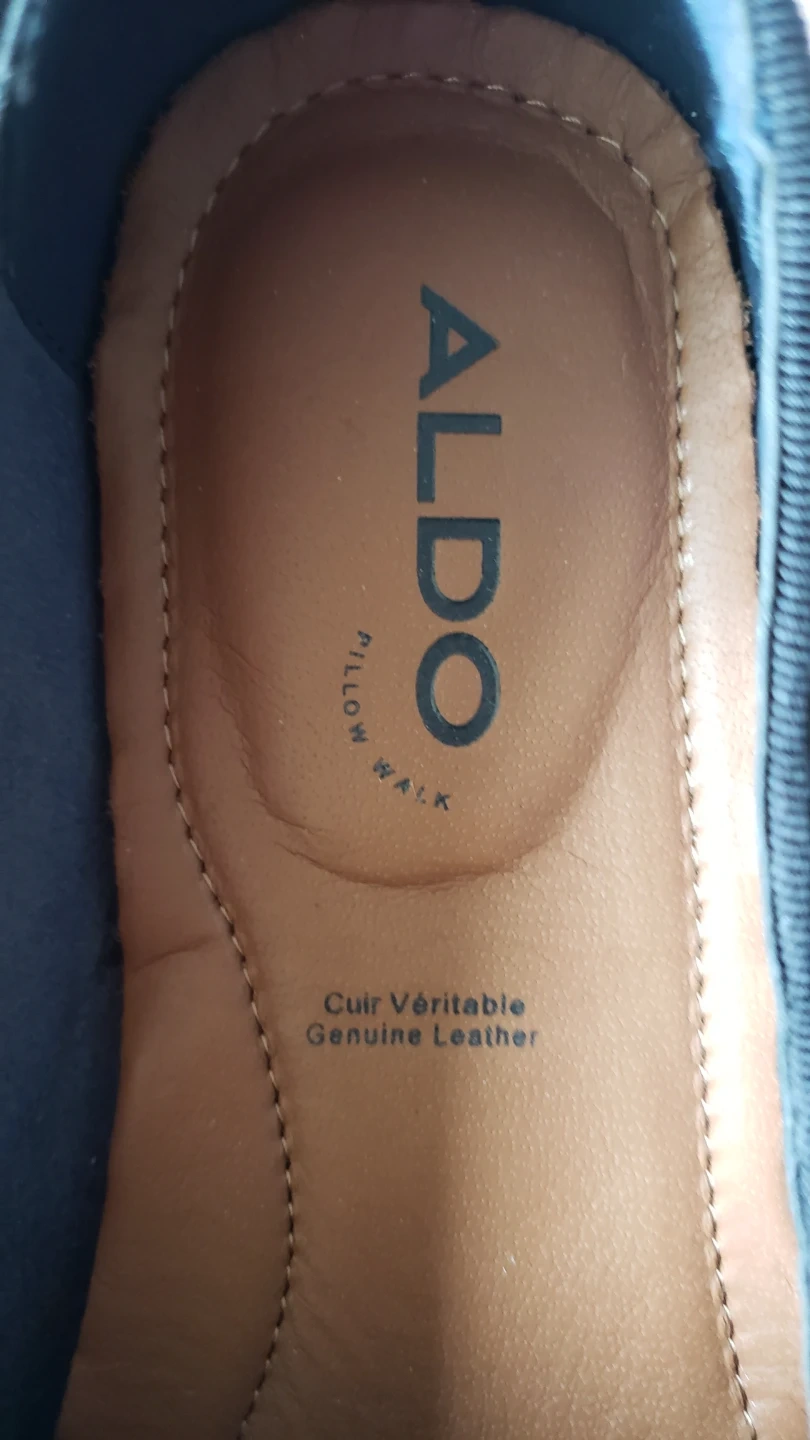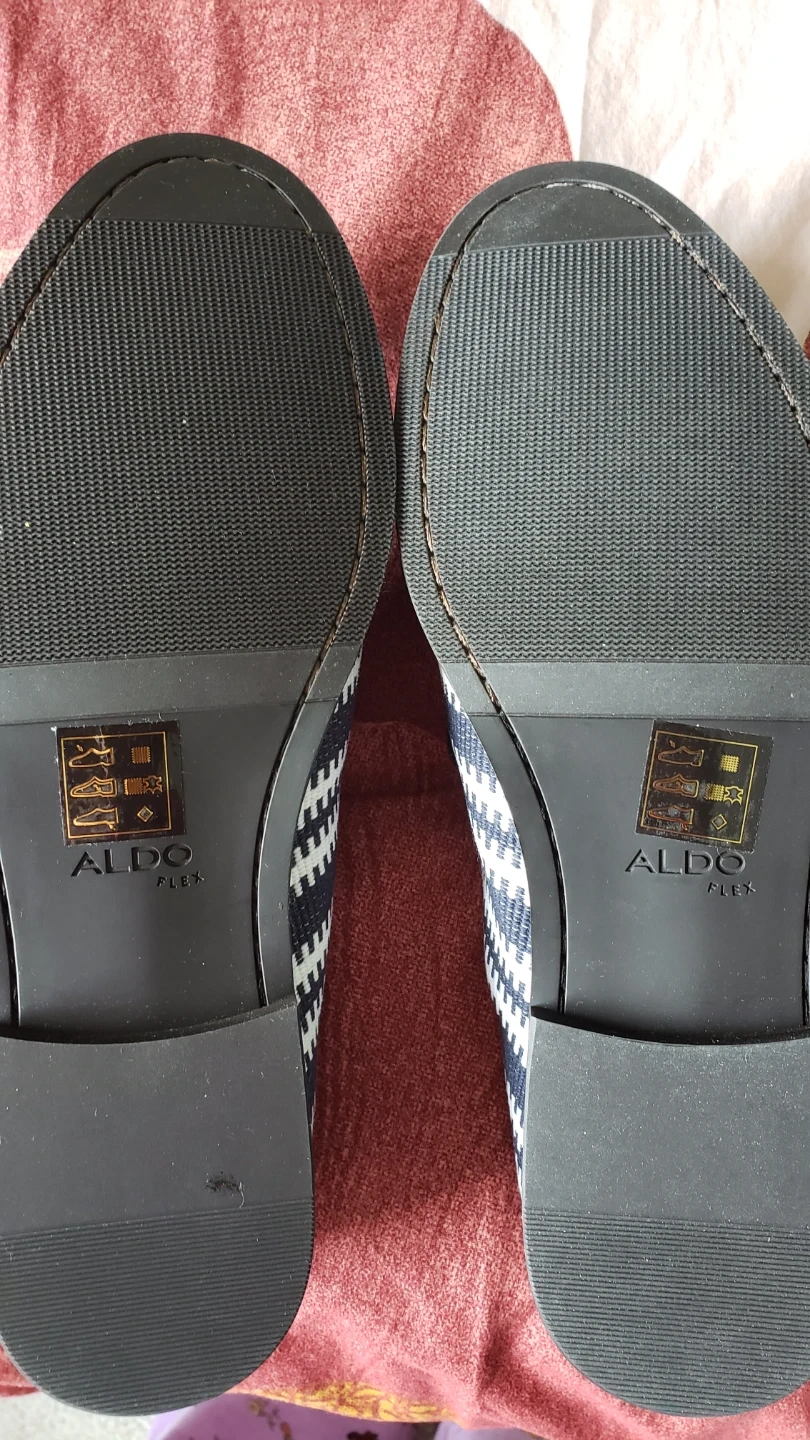 These unisex ALDO loafers feature a stylish navy and white woven pattern. The insole is made of genuine leather for comfort. Made in China.