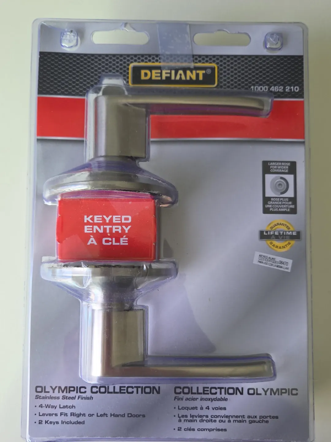 This is a Defiant Olympic Collection keyed entry door lever with a stainless steel finish. It features a 4-way latch and levers that fit right or left hand doors. Key included.