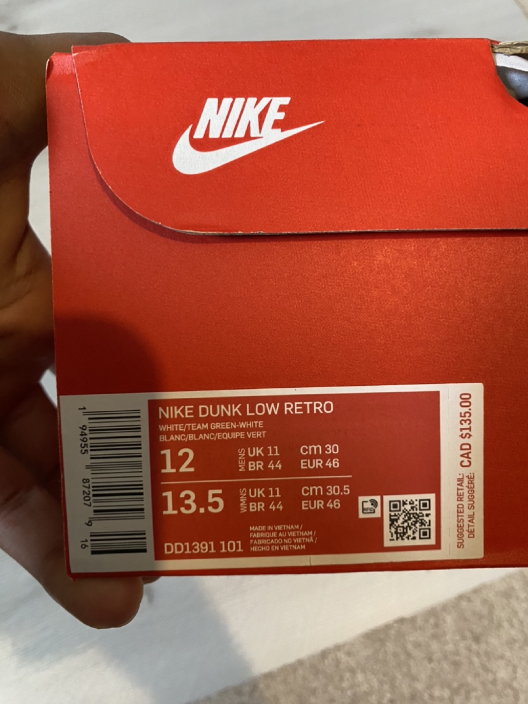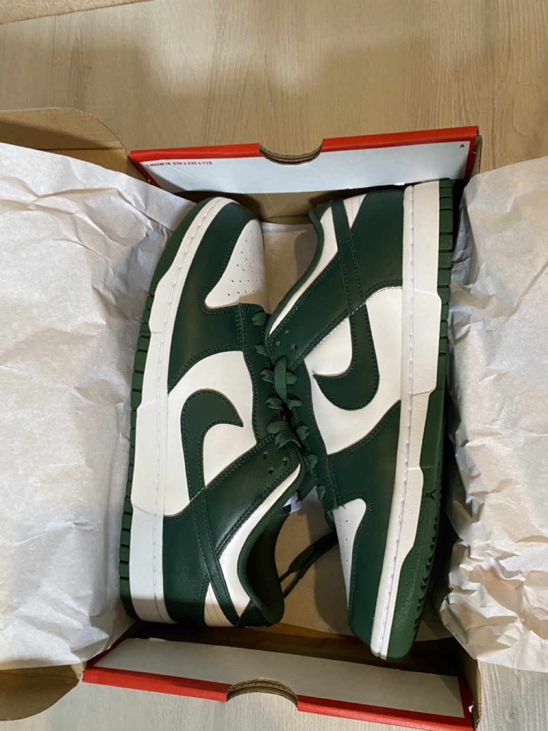 Selling a brand new pair of Nike Dunk Low Retro in the Team Green and White colourway! Michigan state Spartan colour. They are a size 12 US men’s. The original box is included. Retails for $135 CAD. Brand new, unworn, DS deadstock