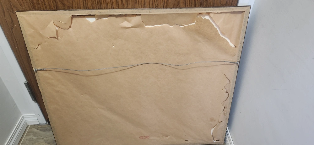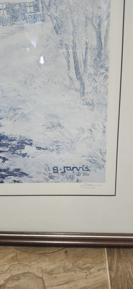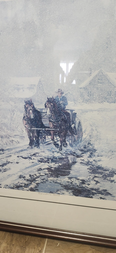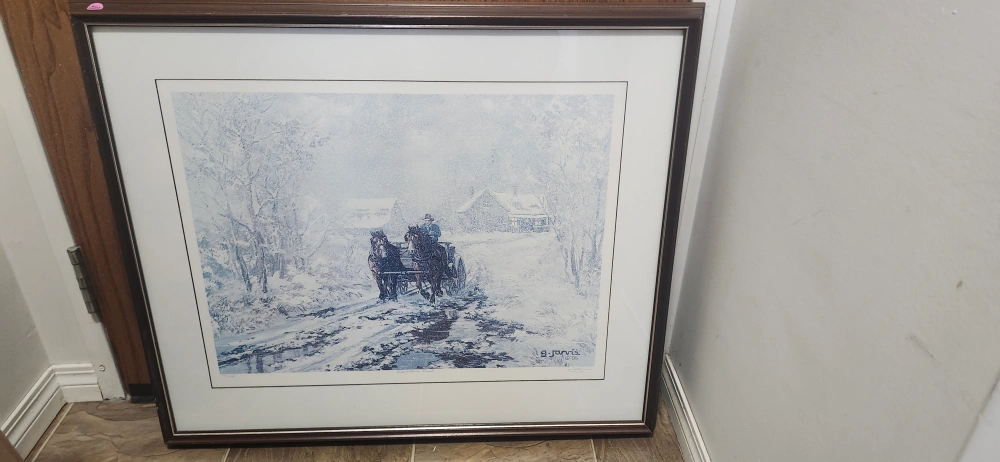 246Framed and numbered print signed by G. Jarvis. The print features a winter scene with horses and a carriage. The frame is brown. The back of the frame has some tears from moving. it will be reflected in the price