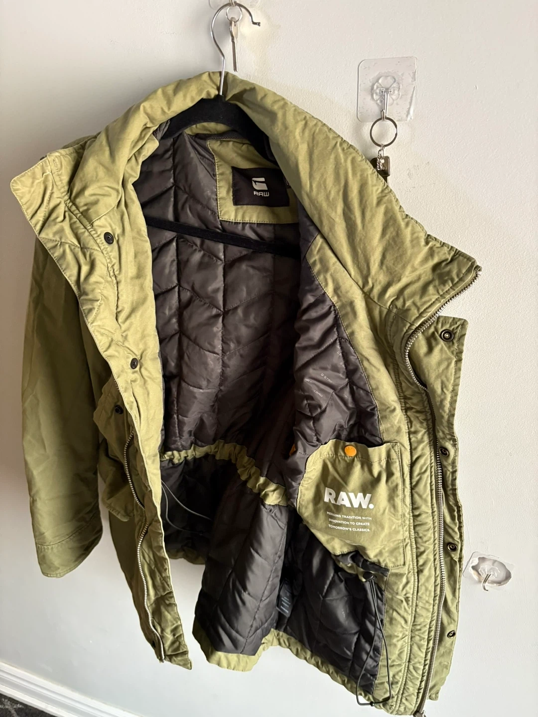 Selling a G-Star RAW jacket in olive green. It's in great condition and ready for a new home! It features a quilted lining and lots of pockets. Perfect for those cooler days!