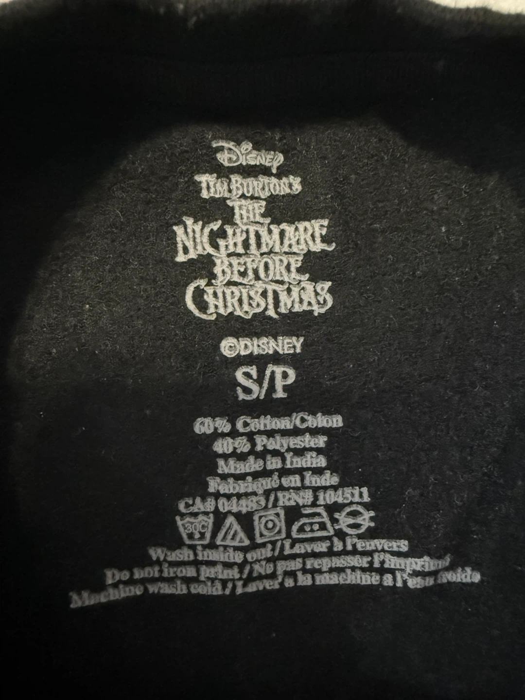I'm selling a Disney Tim Burton's The Nightmare Before Christmas sweatshirt. It's black and a size small. The material is 60% cotton and 40% polyester. It features Jack Skellington's face on the front