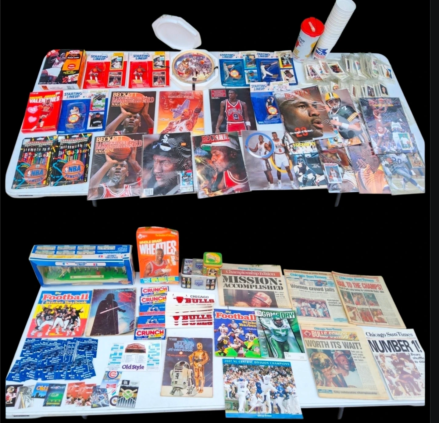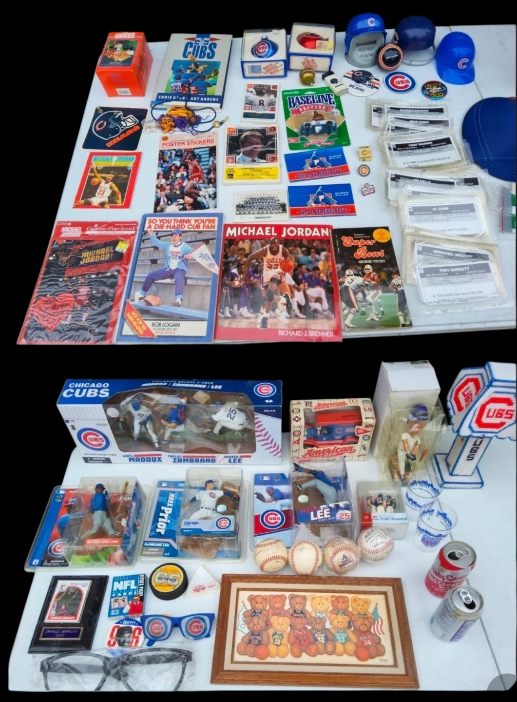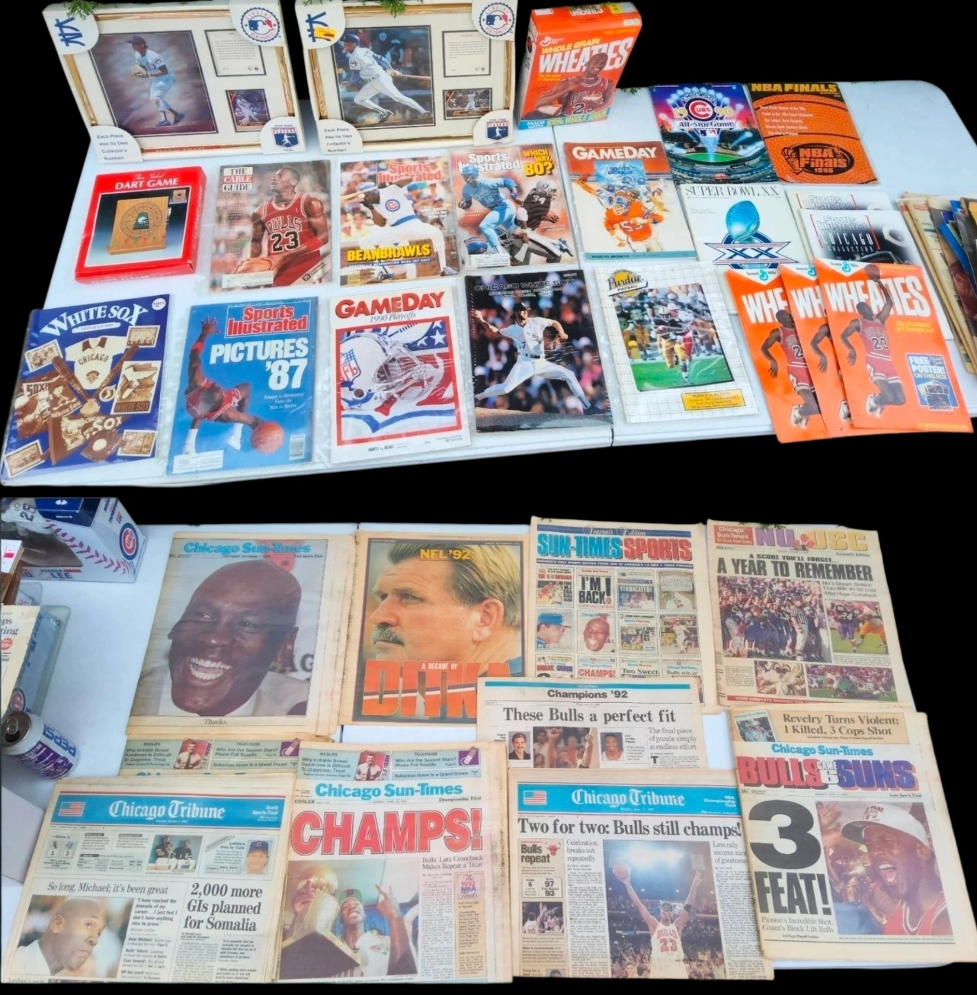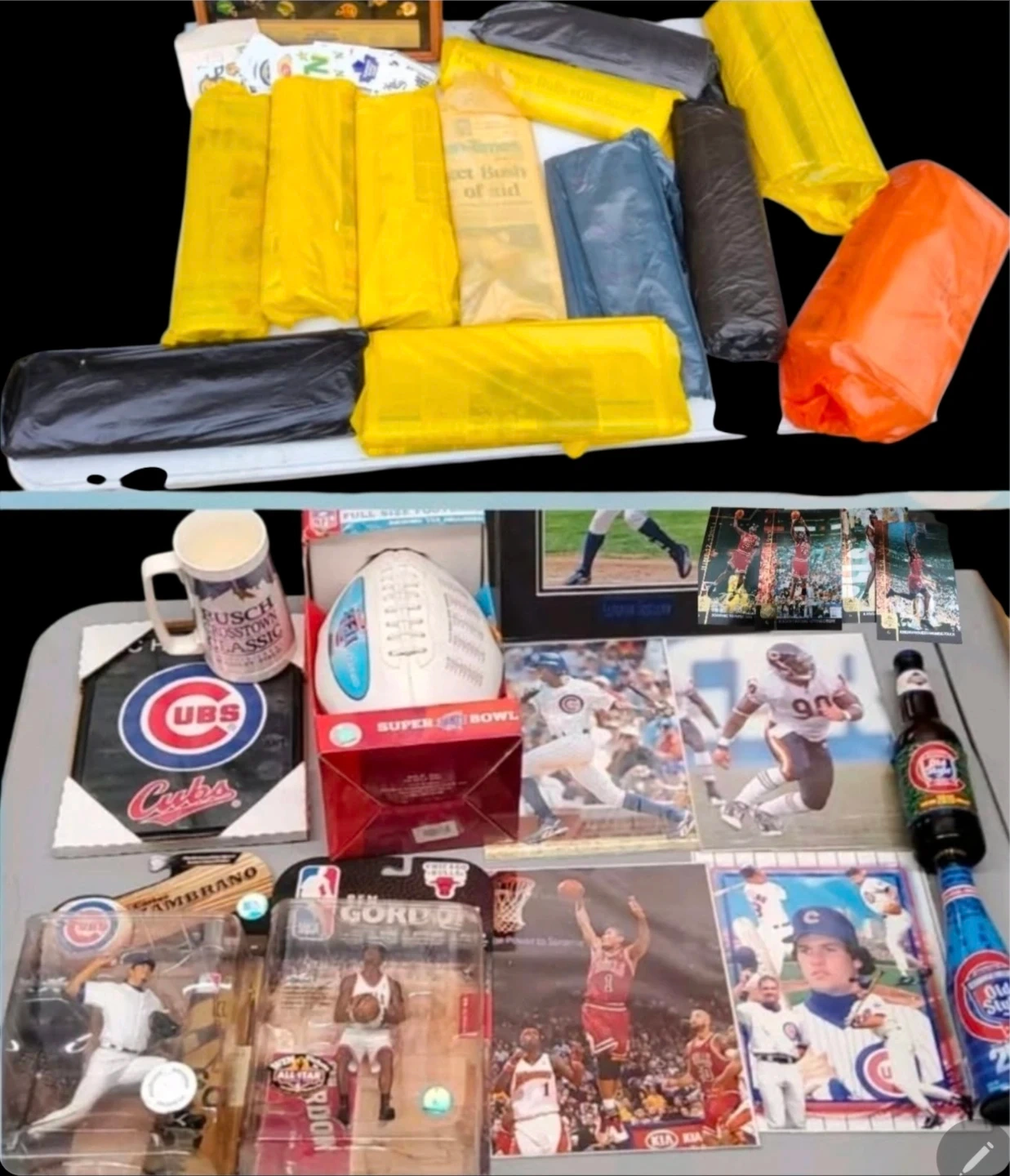 Lastly, you will get everything else you see in the pictures, The the most Amazing largest Chicago City sports collection. Including Signed basballs all in all Chicago Championships collectibles from Sealed New Figures, dozens of time period Championships Newpapers ( note, Newspapers in the bags that you see never have been out the bad, they are not the same as the ones in the pictures ) ,plus time period champs Magazines, time periad, bottles , caps, basballs, football,medals pins and everthing else exet: