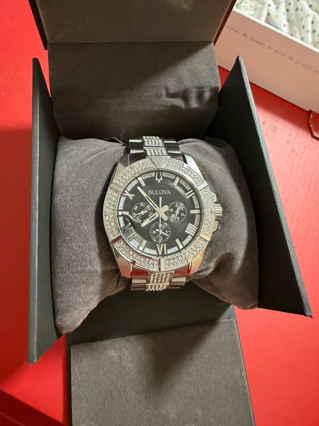 Selling a beautiful Bulova men’s chronograph watch in excellent condition. This watch features a black dial with Roman numerals, diamond-accented bezel, and stainless steel bracelet, giving it a bold luxury look.